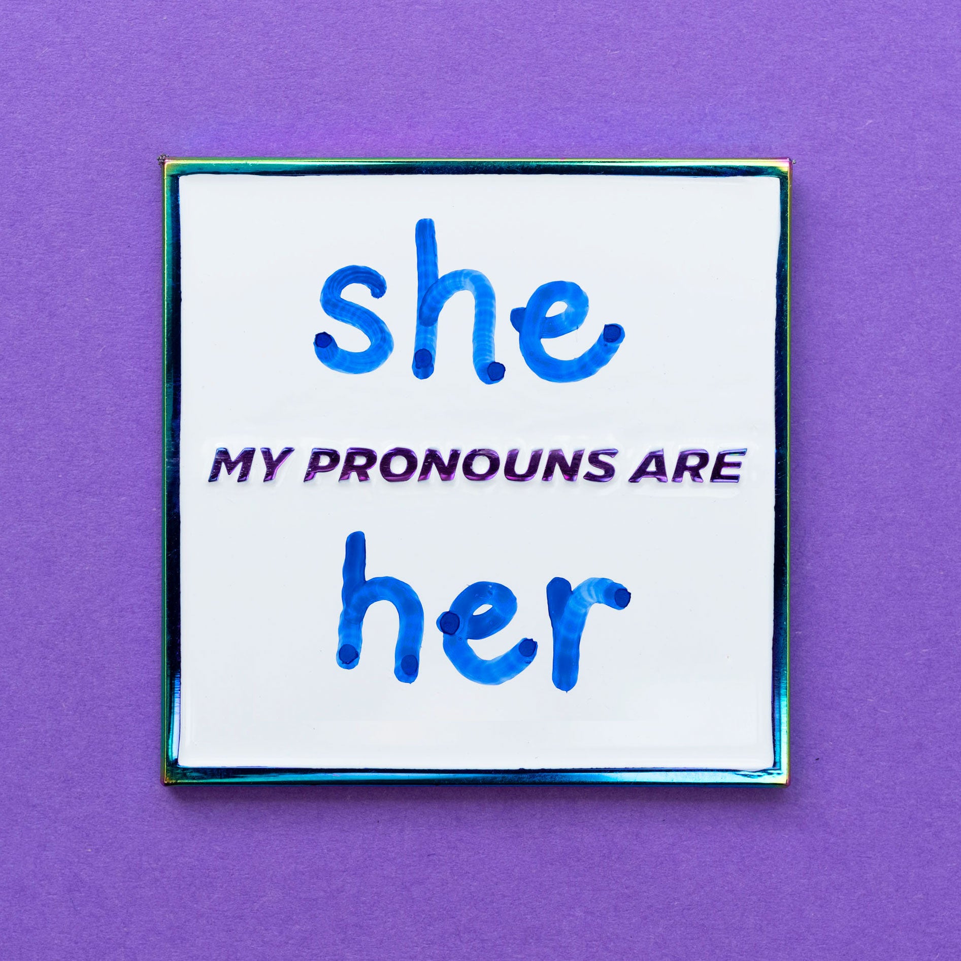 She, they, xe, he? Whatever your pronouns, wear them with pride! Write in your own pronouns using a marker with this customisable enamel pin.