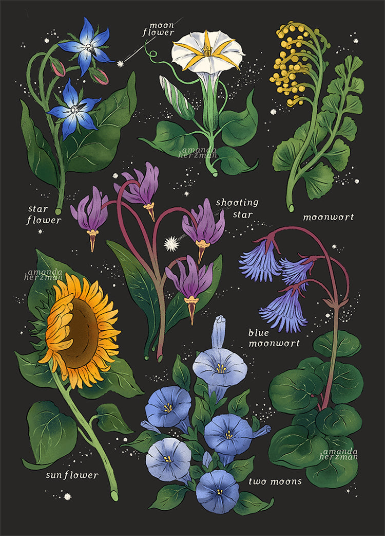 Celestial plants - as above so below. This work was inspired by plant common names and my endless fascination with them. It captures how often we look at plants and see the echoes of the skies above.