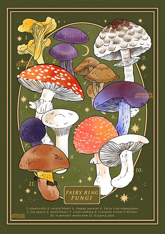 Fairy ring fungi is a collection of fungi that form rings or circle formations in their habitats. These rings are known in folklore and superstition as fairy rings that can whisk away the unwary wanderer underhill. Scientifically we know there are at least 60 species of fungi that create fairy rings. This artwork is inspired by these fascinating fungi formations.