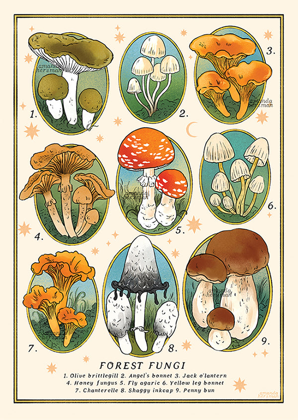 Fungi of the forests (and some pastures) this colourful print is inspired by the intriguing fungi kingdom.