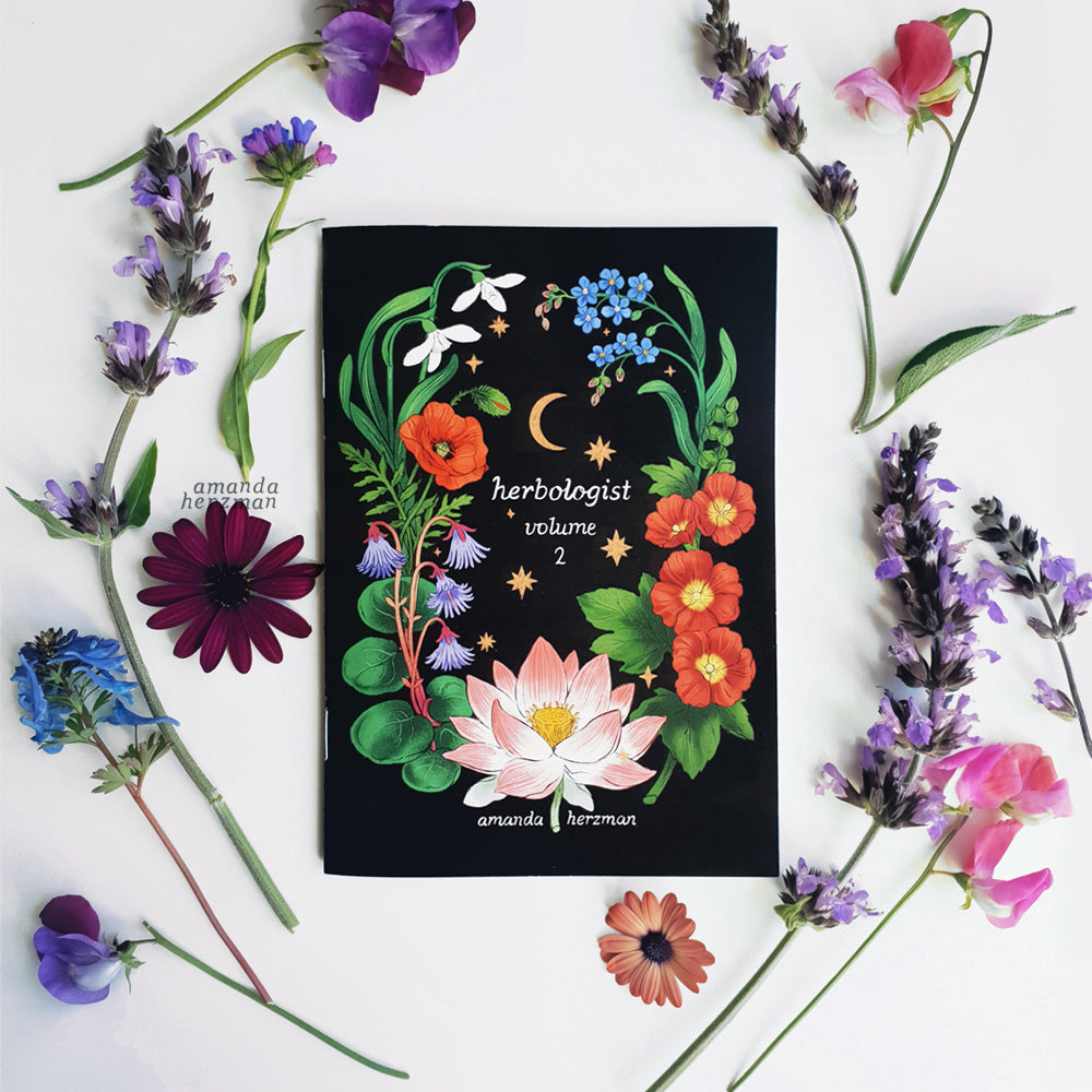 Herbologist Volume 2 collects together a year of my patreon rewards from November 2020 to October 2021. It features 13 plant illustrations and their associated folklore, facts and mythology. This zine is A5 in size (14.8 x 21 cm) with saddle stitch binding. It contains 40 full colour pages inside.