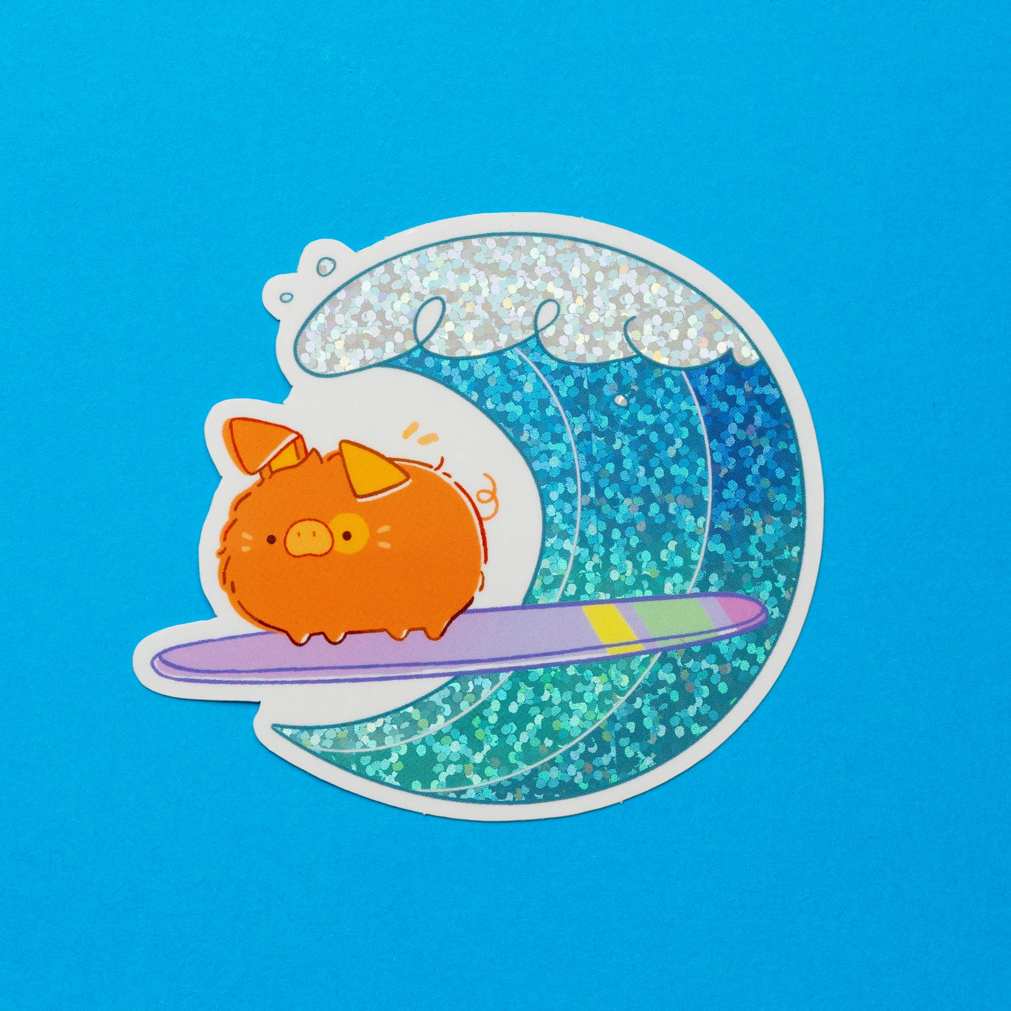 Surf's up! A glittery vinyl sticker of a cute piggy surfing.
