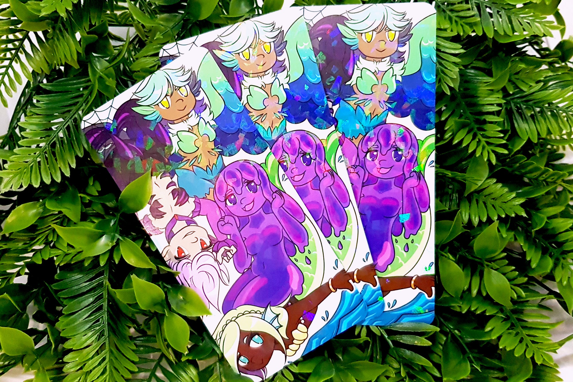 The first designs of Batwing Tensei's Monster Girl Menagerie have come together for this vivid bookmark! Featuring the Arachne, Harpy, Slimegirl and Mermaid, this holographic bookmark is a must have for all monster girl lovers! The back features Tensei's trademark sona pattern in matte pastels, the perfect contrast to the bright colours on the front.