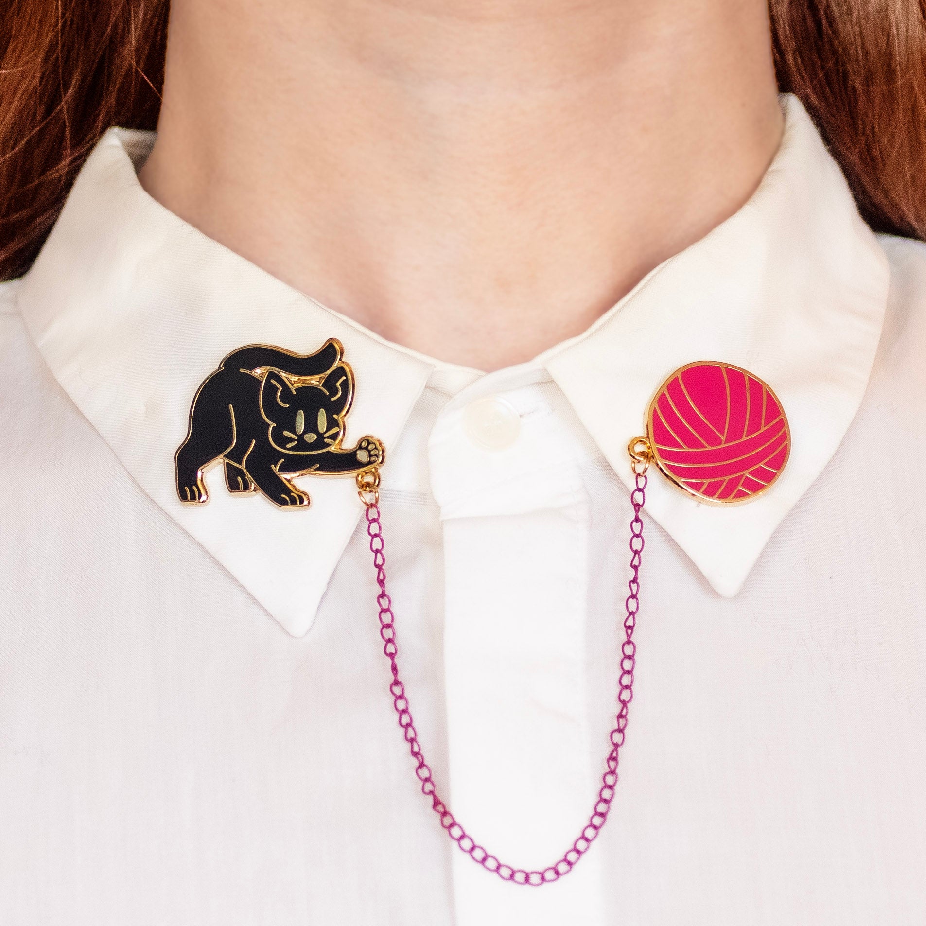 Y'know, like nya! These adorable kittens are ready to chase yarn across your lapels! Featuring the smallest of toe beans and ~15cm of chain, these sets sit perfectly on collared shirts. Each pin has one back clasp for easy attachment to collars.