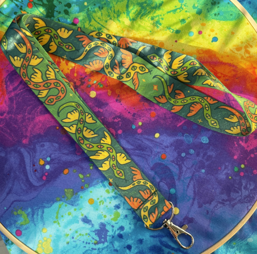 A lanyard featuring green serpents.