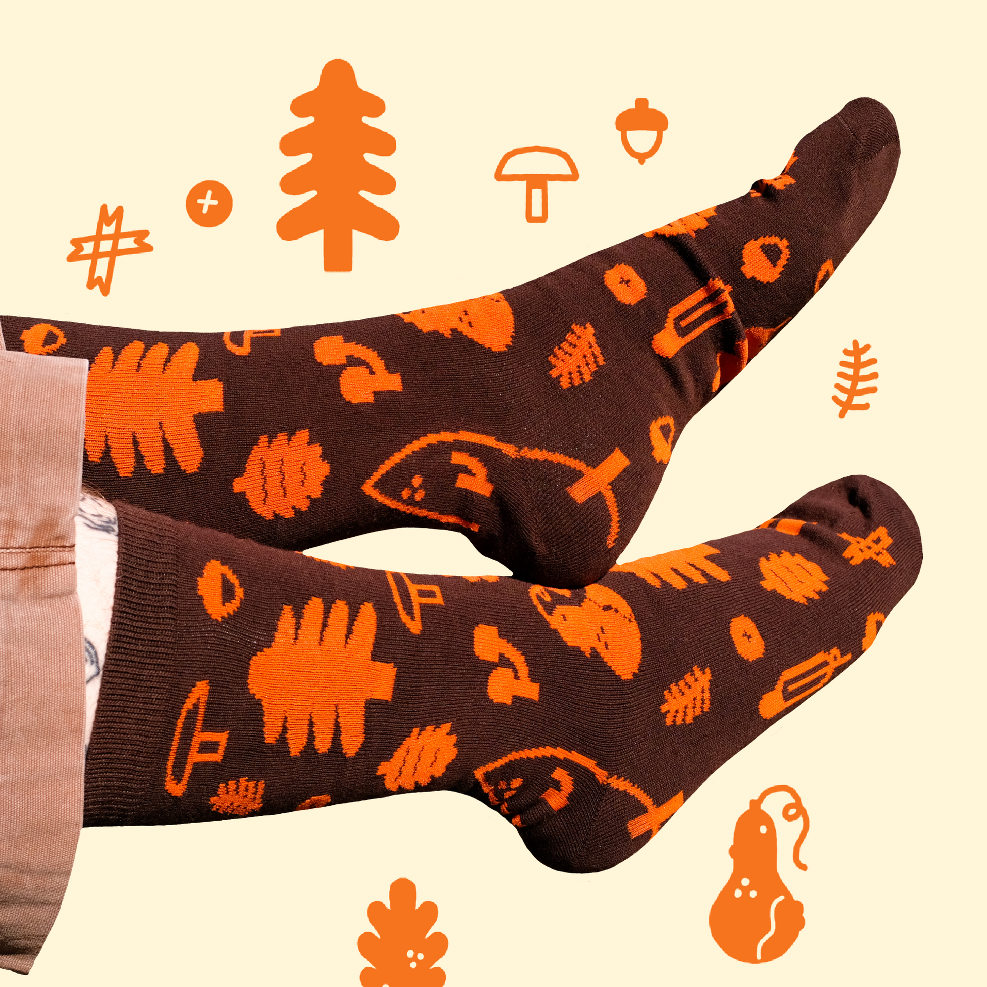 100% cotton socks, deep cocoa brown with a rust orange design!