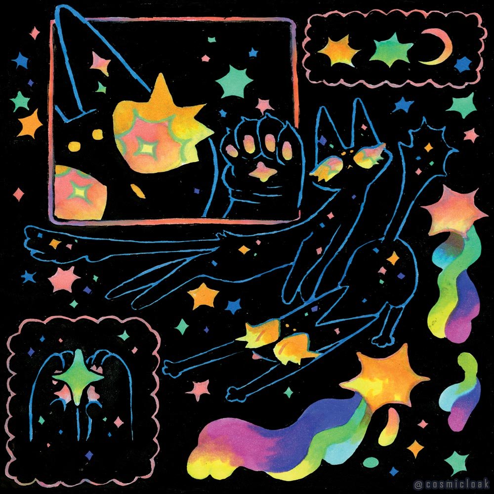 Features a mischievious black cat with glittering fur, hunting shooting stars. Printed on Satin 260gms paper.