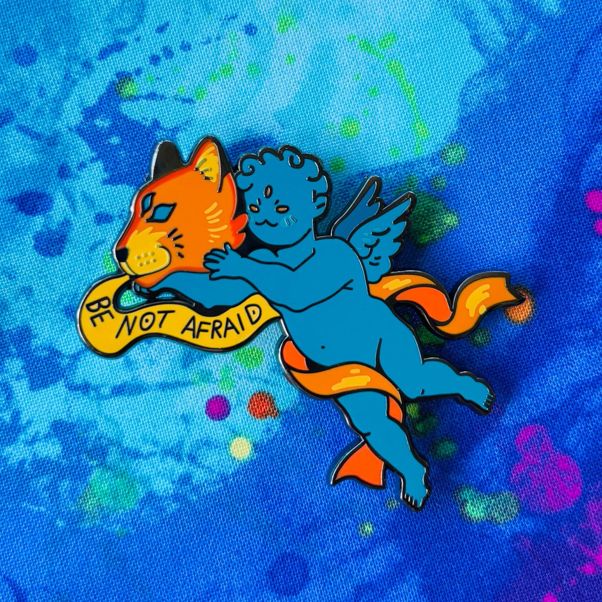 | A little putto (cherub) for the constellation Leo. Each pin is about 2 inches (5 cm) wide with hard enamel, black nickel plating, and screenprint. They have two pin posts and rubber backings. |