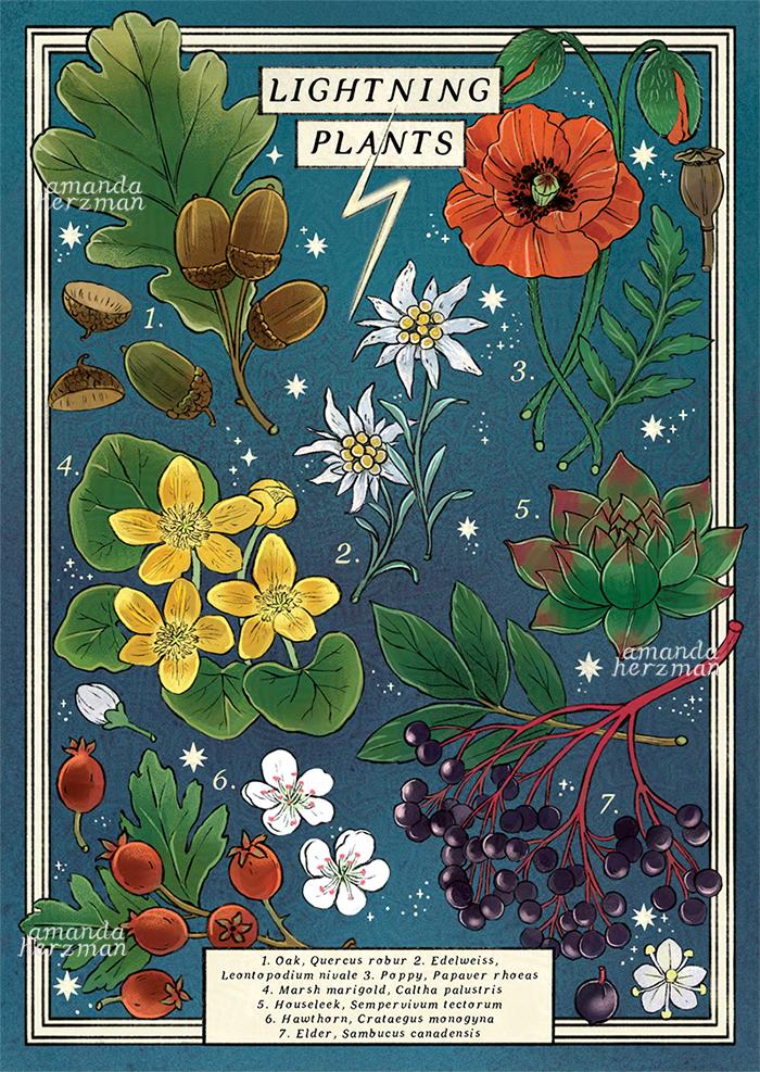 Associated with lightning lore, these fascinating trees and plants both attract and repel lightning in myth and folklore. This print lists the common names and scientific names and is A5 in size (14.8 x 21 cm).