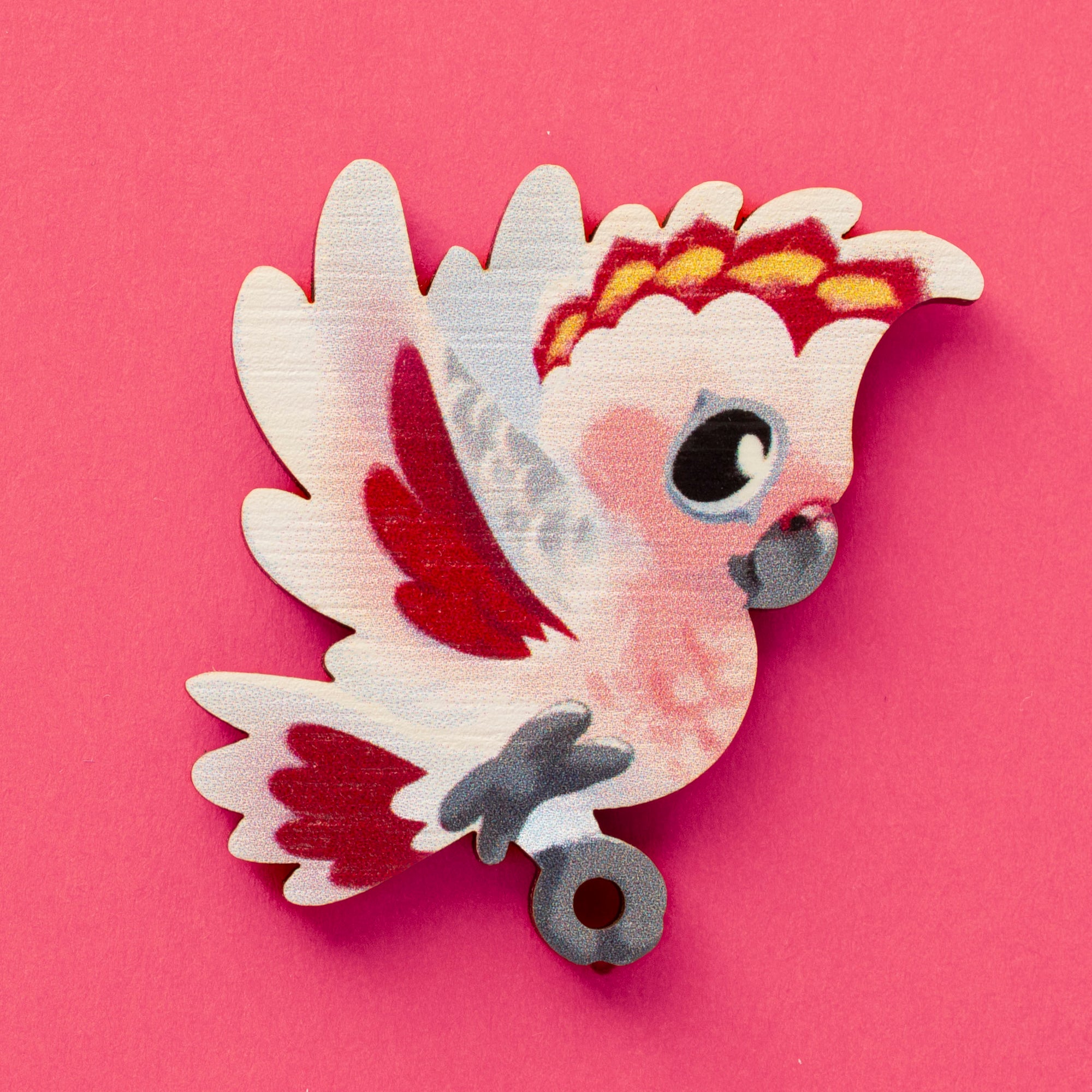 These little Aussie cockatoo pins are printed in full colour on sustainably sourced wood! They have two pin posts on the back to keep them securely in place wherever you put them (unlike the real thing) and feature a little gloss finish on their eyes for that extra spark of life when they catch the light.