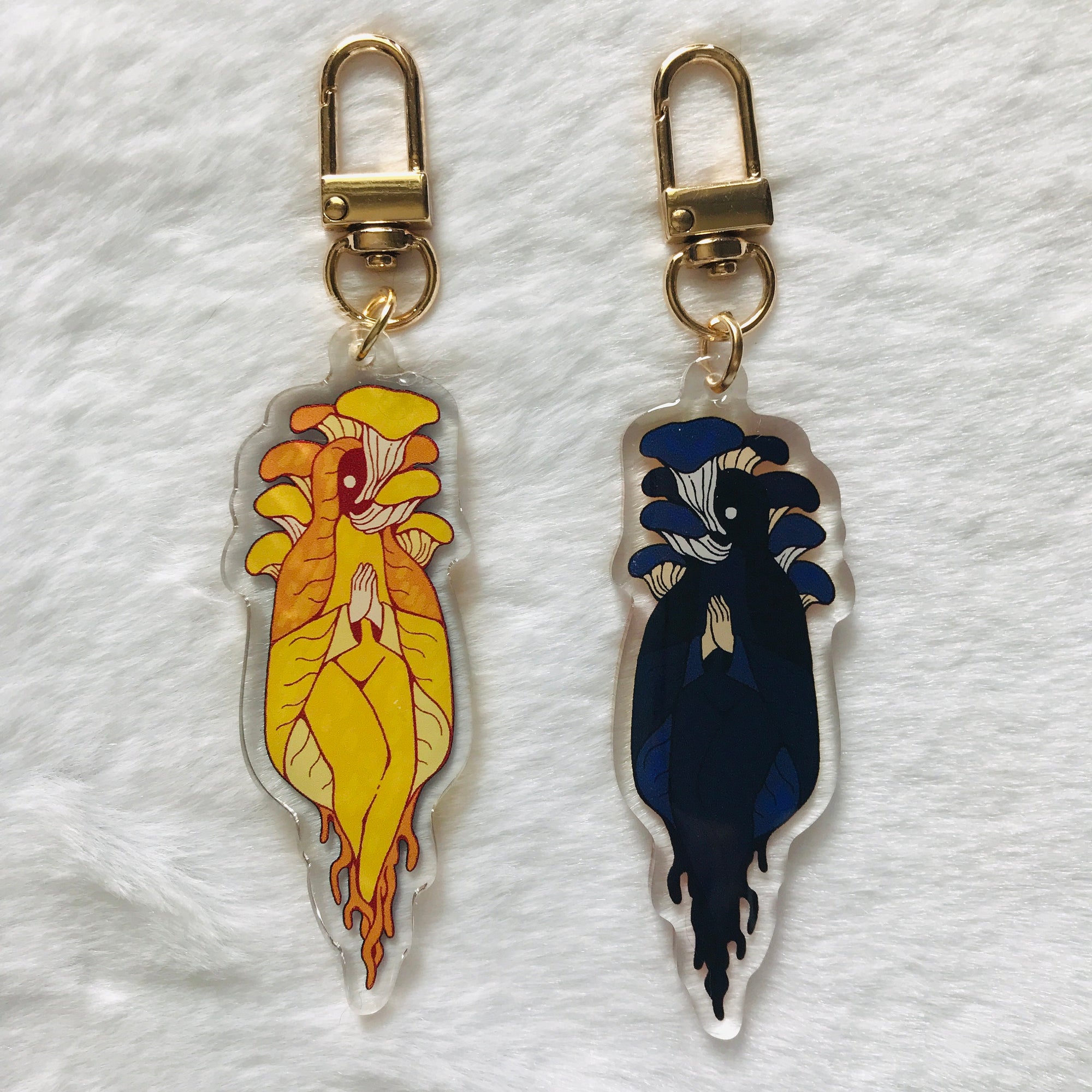 This acrylic keychain is 3 inches (7.6 cm) long, double-sided with a different print on each side. The keychain has a gold lobster clasp and epoxy on one side.