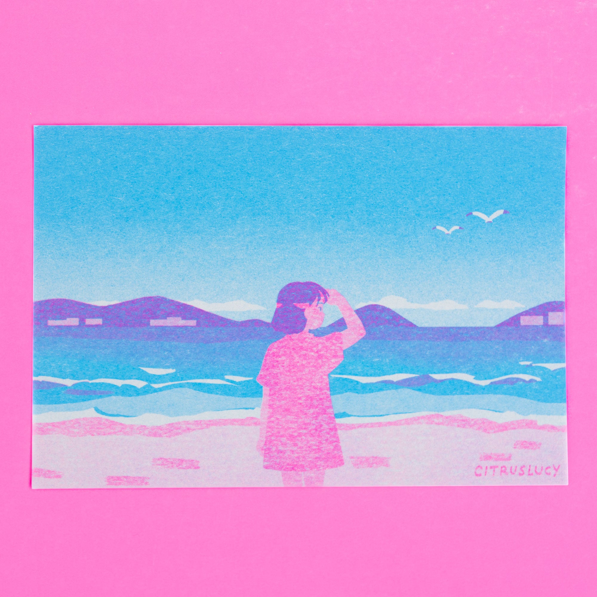 Let's enjoy the salty ocean breeze and summer air. Two colour risograph postcard, printed in Japan.