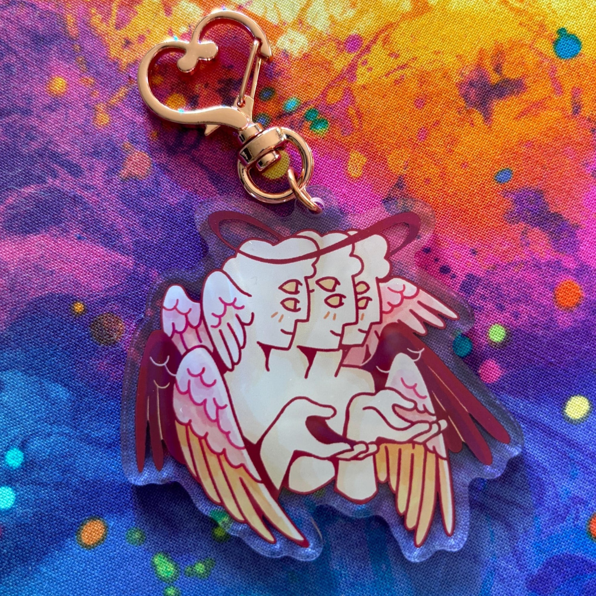 This acrylic keychain is 2.5 inches (6.3 cm) on the longest side, double-sided with the same print on both sides; it has a rose gold heart clasp.