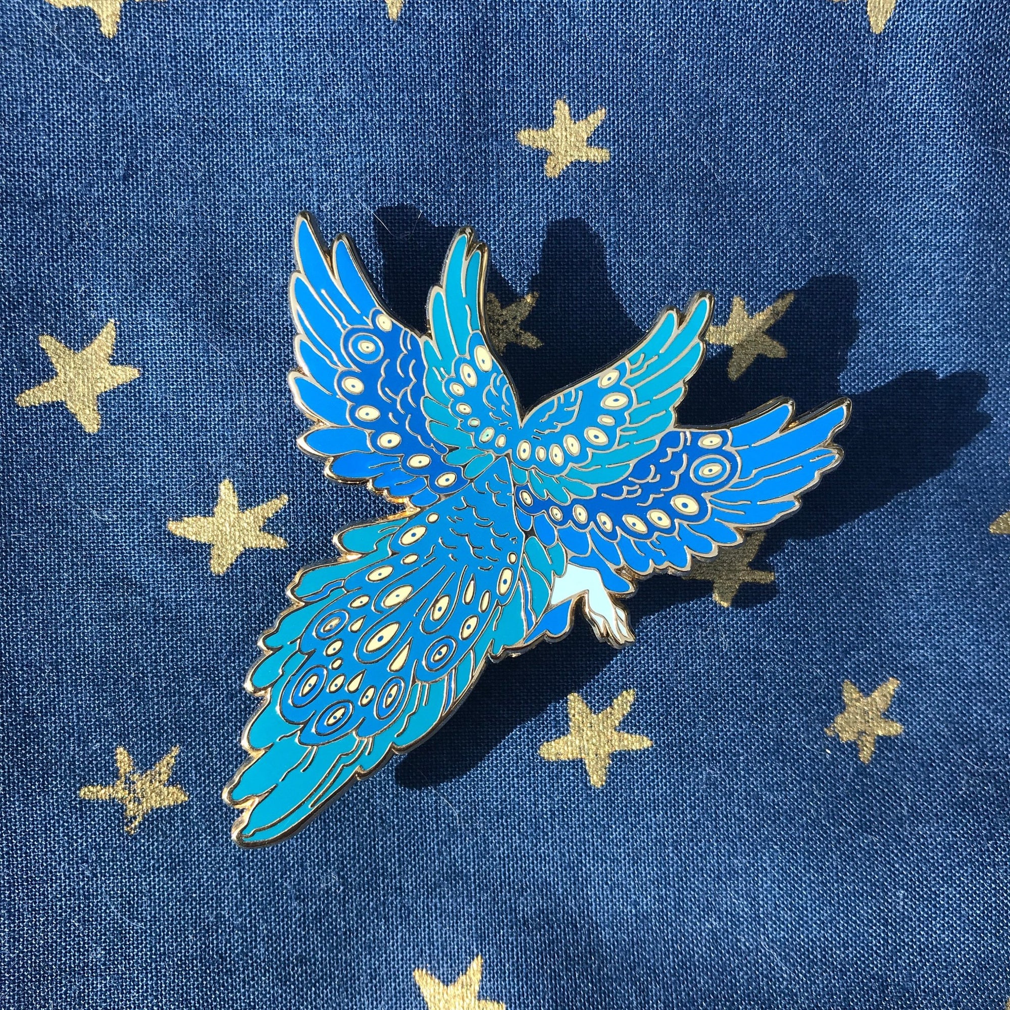 | This pin is 2 inches (5 cm) long, with gold plating, screenprint, and hard enamel. It has two pin posts and rubber backings. |