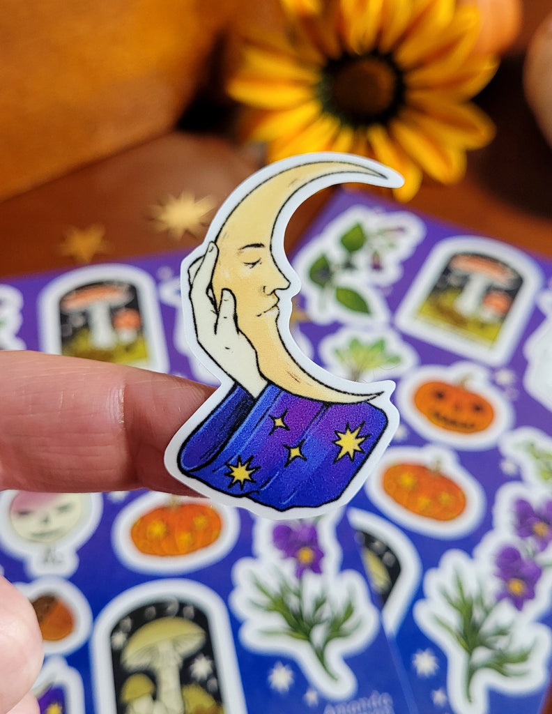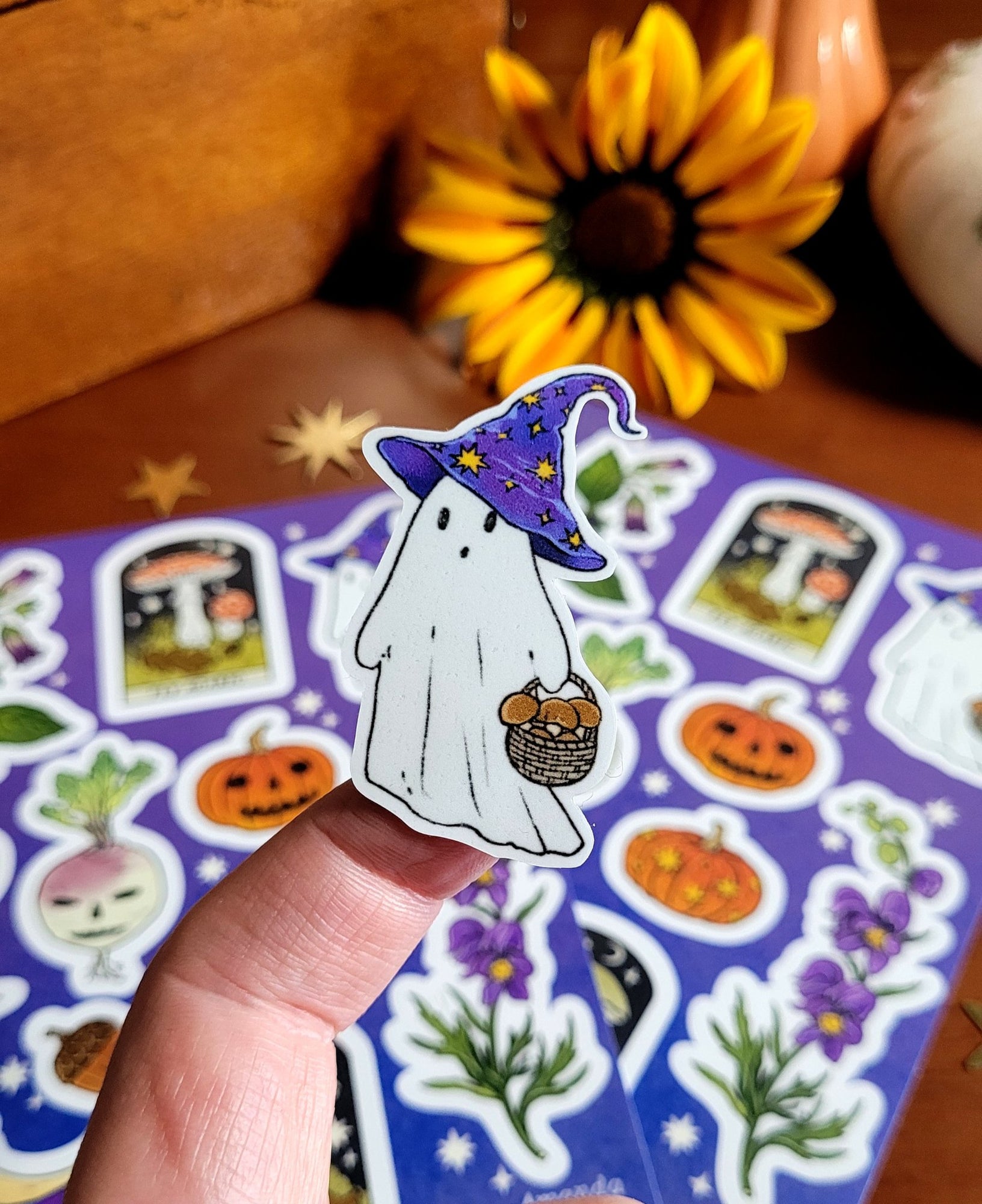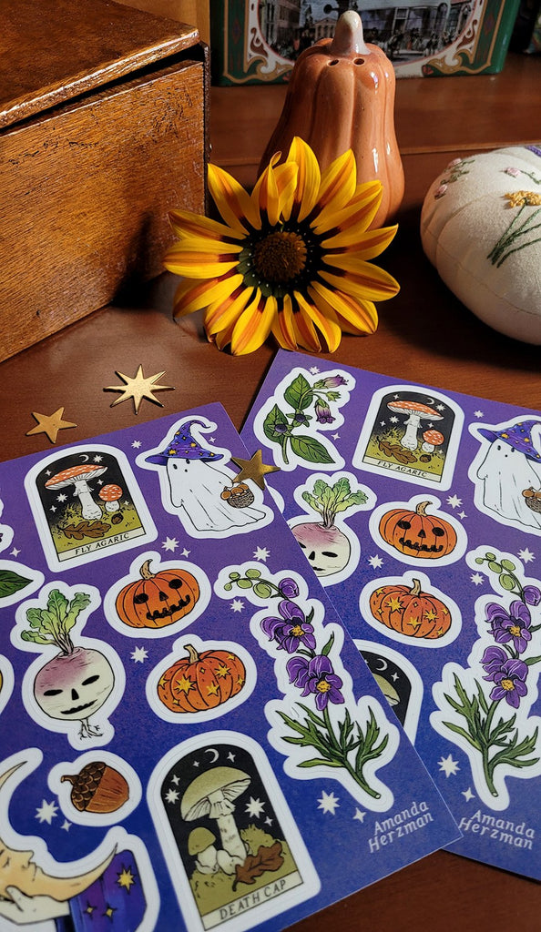 This sticker sheet celebrates autumn and the spooky season. It is A6 postcard size, and is printed on paper vinyl.