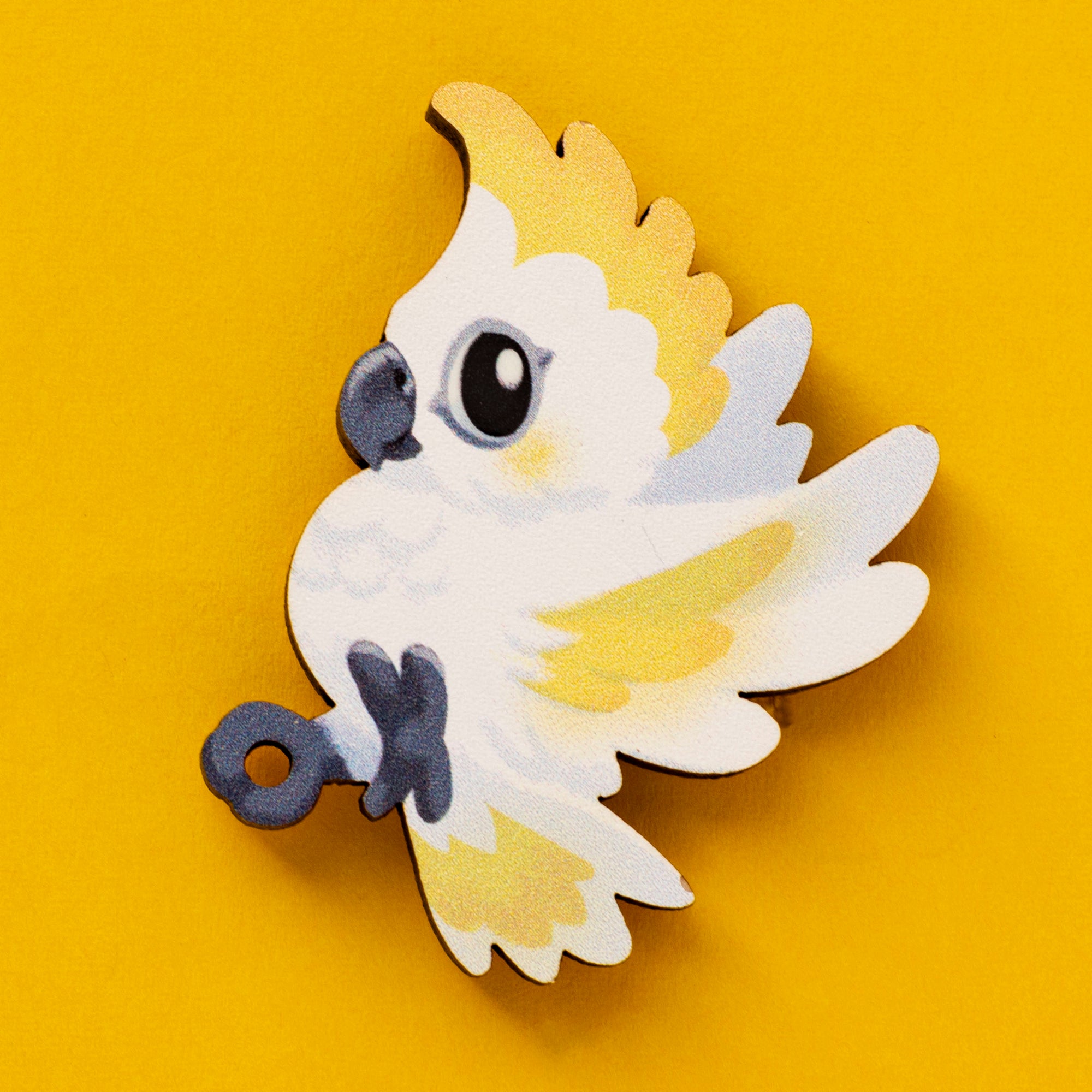 These little Aussie cockatoo pins are printed in full colour on sustainably sourced wood! They have two pin posts on the back to keep them securely in place wherever you put them (unlike the real thing) and feature a little gloss finish on their eyes for that extra spark of life when they catch the light.