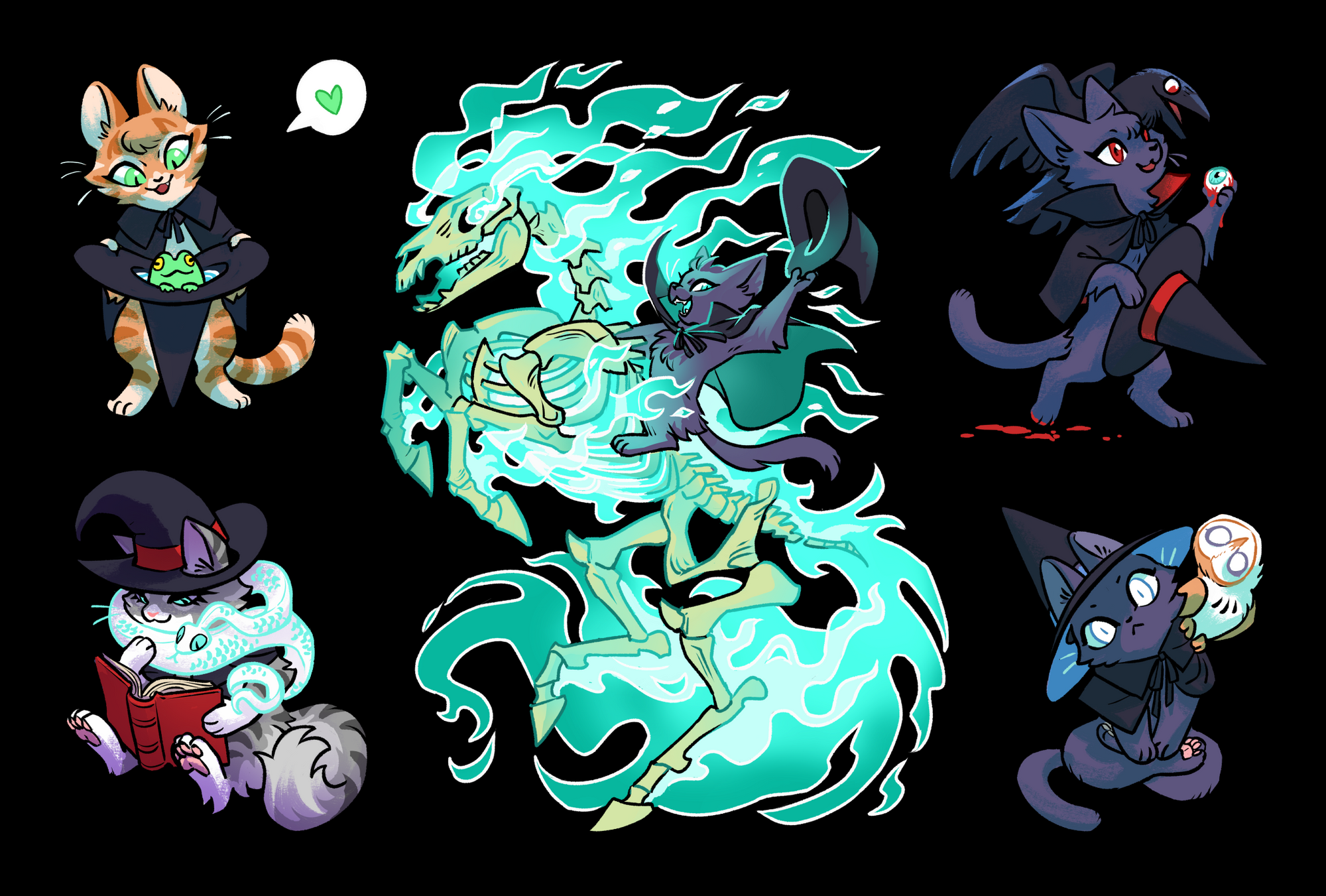 Witch Kitties are back for a third year to provide year-round Halloween cheer for the many flat surfaces in your life! :3c This time they've brought some familiar friends - animal companions just as cute and/or spooky as they are! Each individual kitty design is kiss cut to peel off the sheet with ease. :3c The sheet measures 6x4 inches and each sticker is around 1.5 inches tall with the obvious exception of the big horse sticker that is more like 3.5 inches! The sticker sheet is printed on fancy holographic vinyl so that certain parts (such as the flames and ghosts) have a reflective holo effect that looks great in person! This gloss laminated holo vinyl is also super durable and will hold up to years of outdoor use or heavy handling. Perfect for personalising gaming consoles, phones, journals, water bottles, and more!