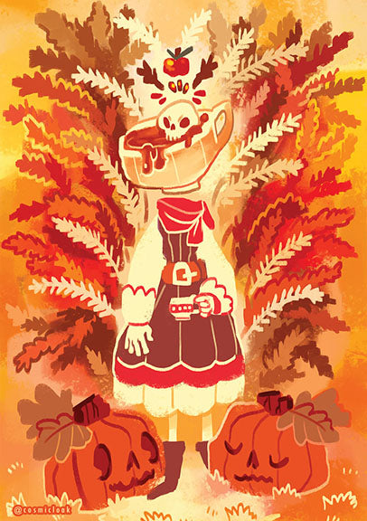 Features cosmicloak's character, a tea cup, contains a sugar skull steeped in a warm autumn tea. They are surrounded by a corn maze & pumpkin friends. Printed on Satin 260gms paper.
