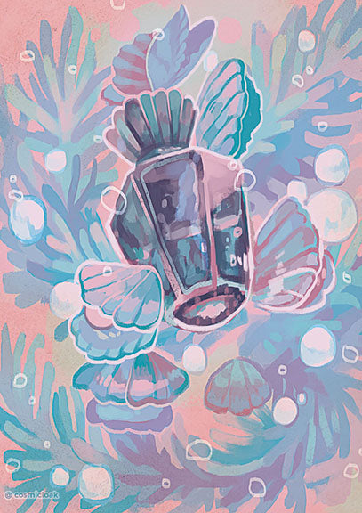Print features a misty bed of kelp with floating precious pearls. Crowning the kelp is a perfume vial filled with a mysterious aroma from the deep ♡ Printed on Satin 260gms paper.