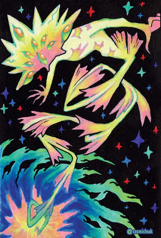 the space phenomena, a gamma ray, illustrated as a mermaid. It's emerging from a black hole. Part 3 of 5 of "Mermay 2023" series