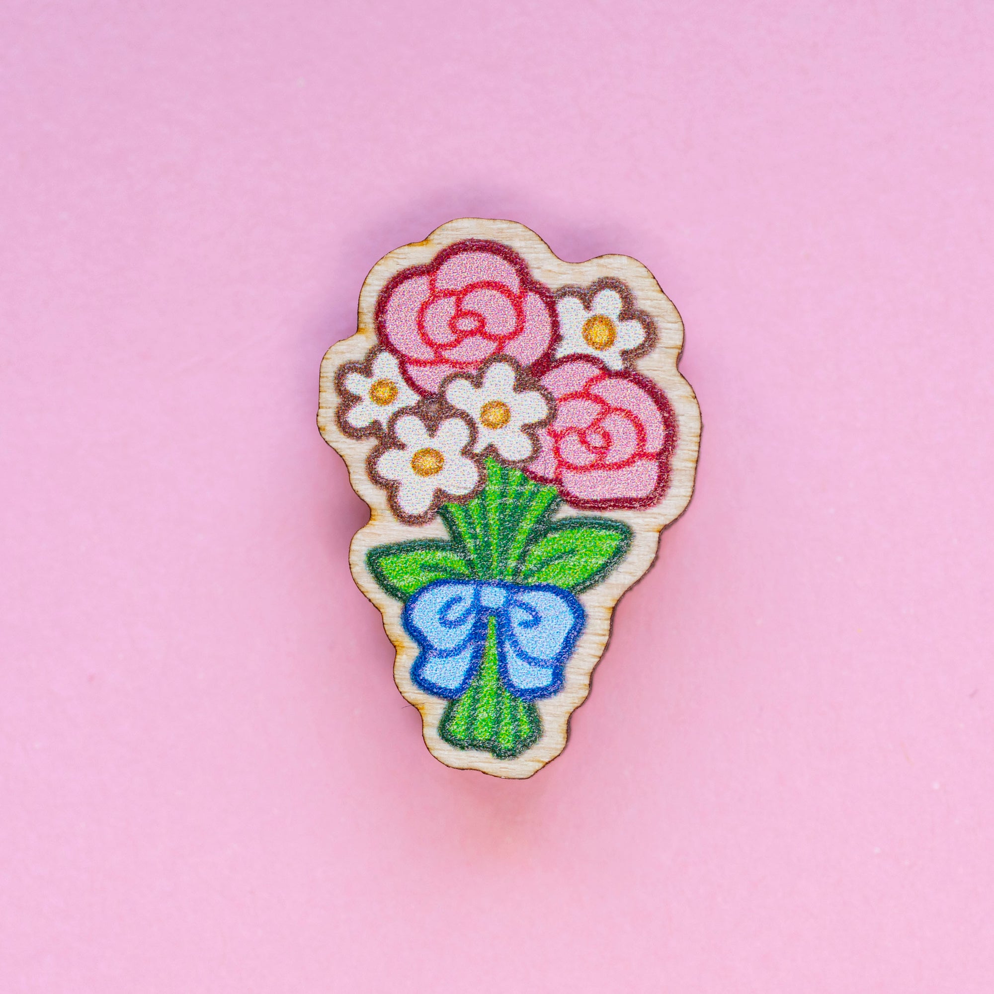 This bouquet mini wood pin is maple wood with a matte finish. They measure about 1โ tall and have a pink rubber clutch backing. These are a perfect addition to a pin board or ita bag, or as a cute accent on a jacket or bag!