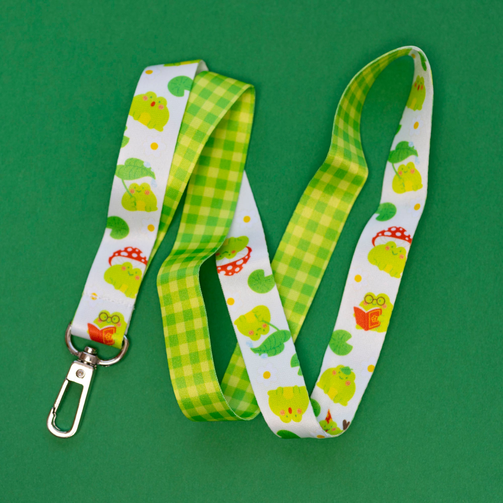 This frog themed lanyard measures about 0.8โ wide and 17โ long and has a swivel clasp on the end.