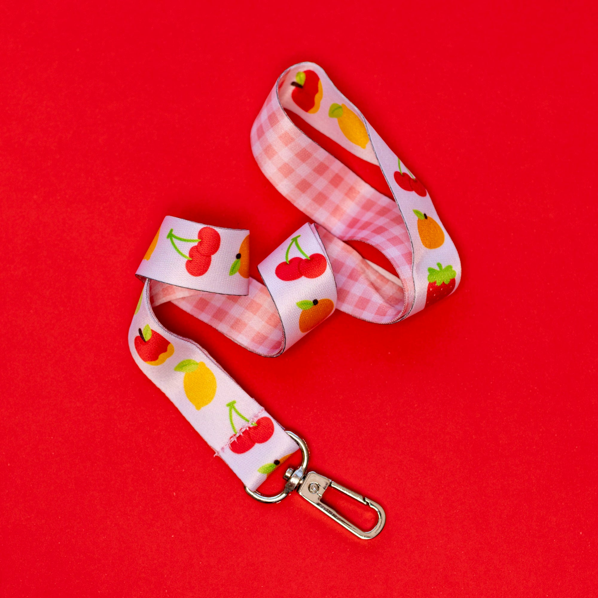 This fruit themed lanyard measures about 0.8โ wide and 17โ long and has a swivel clasp on the end.