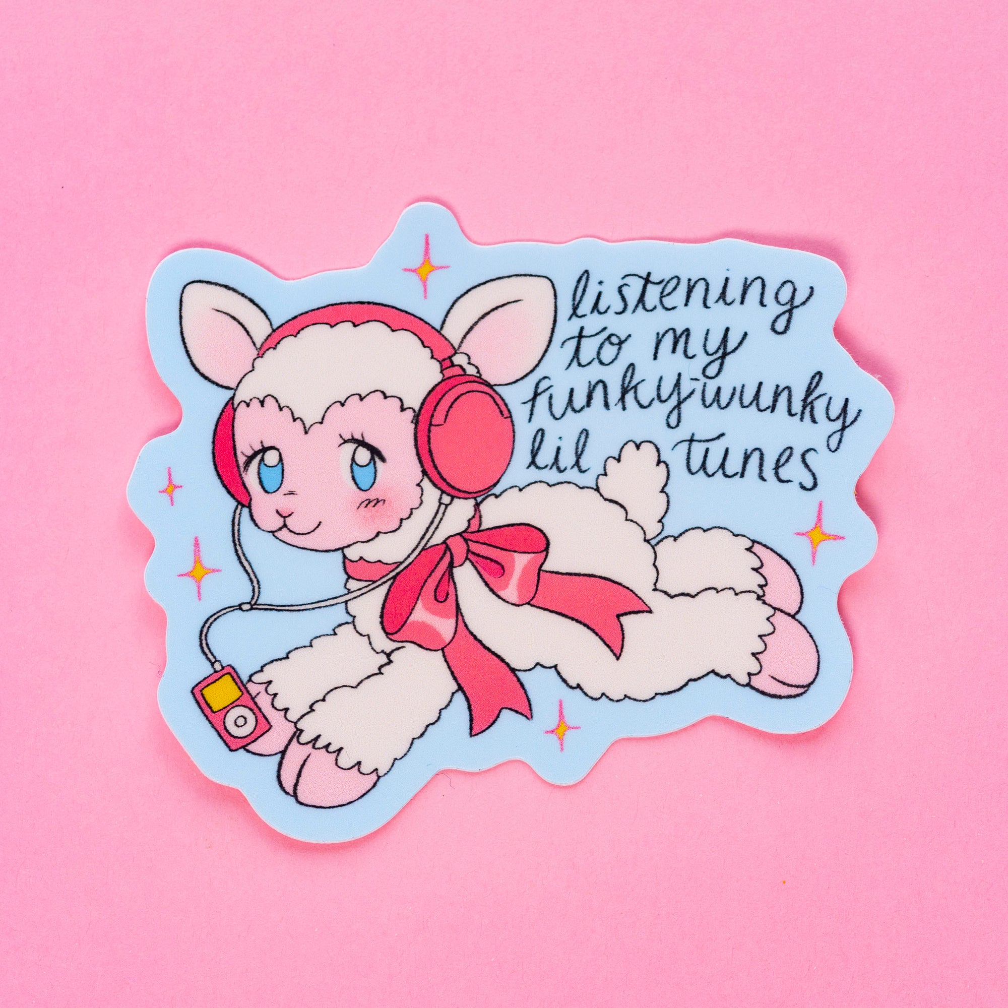 This "Listening to my funky-wunky lil tunes" sticker is 3โ wide and has a matte finish. These stickers are perfect for decorating your laptop, water bottle, journal, and more!