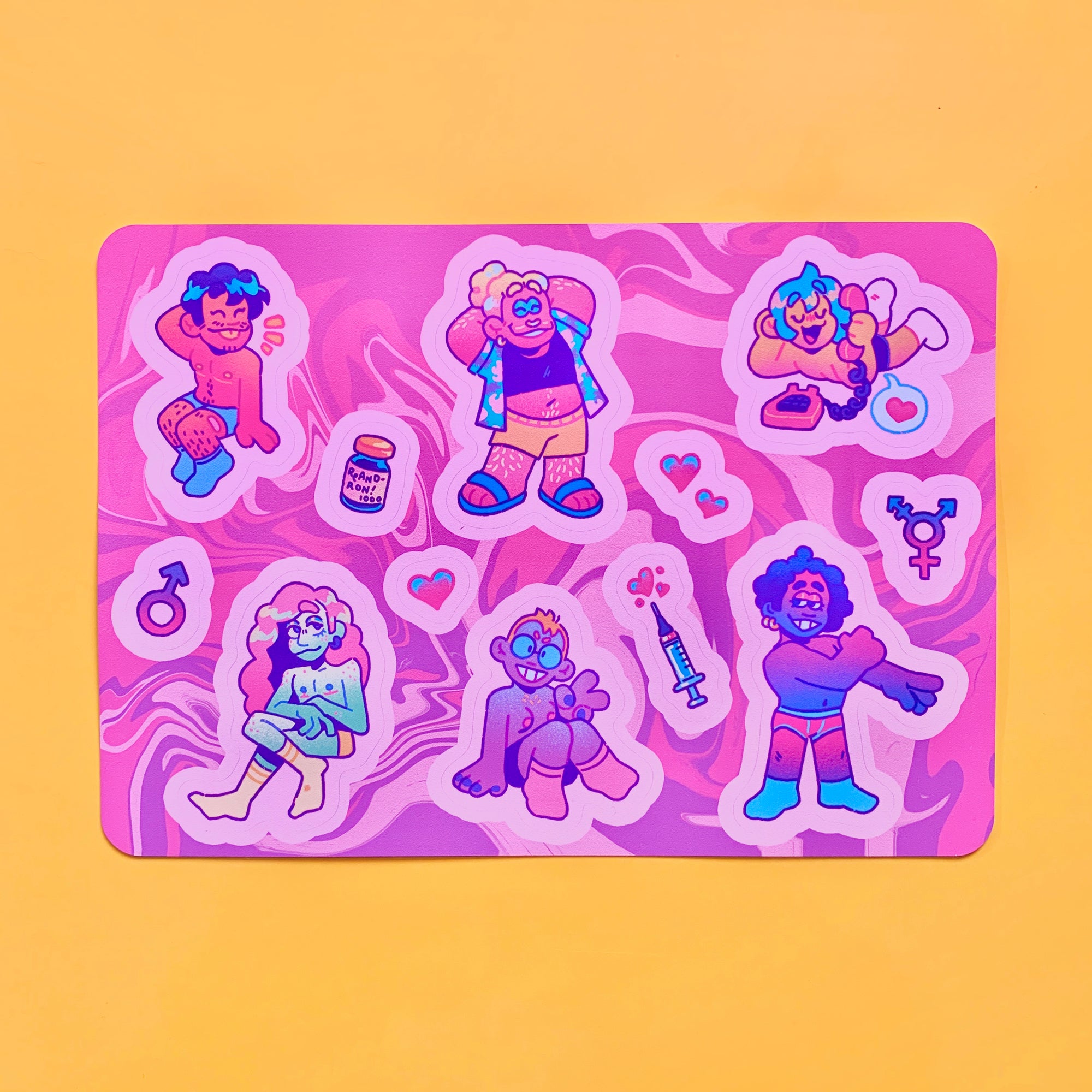 Love is beautiful (duh)! Transgender men are beautiful (DUH)! Show the world your support for trans masculine people of all shapes and sizes with this A5 sticker sheet, featuring kiss-cut stickers of six lovingly illustrated guys and an assortment of trans-masc knick-knacks.
