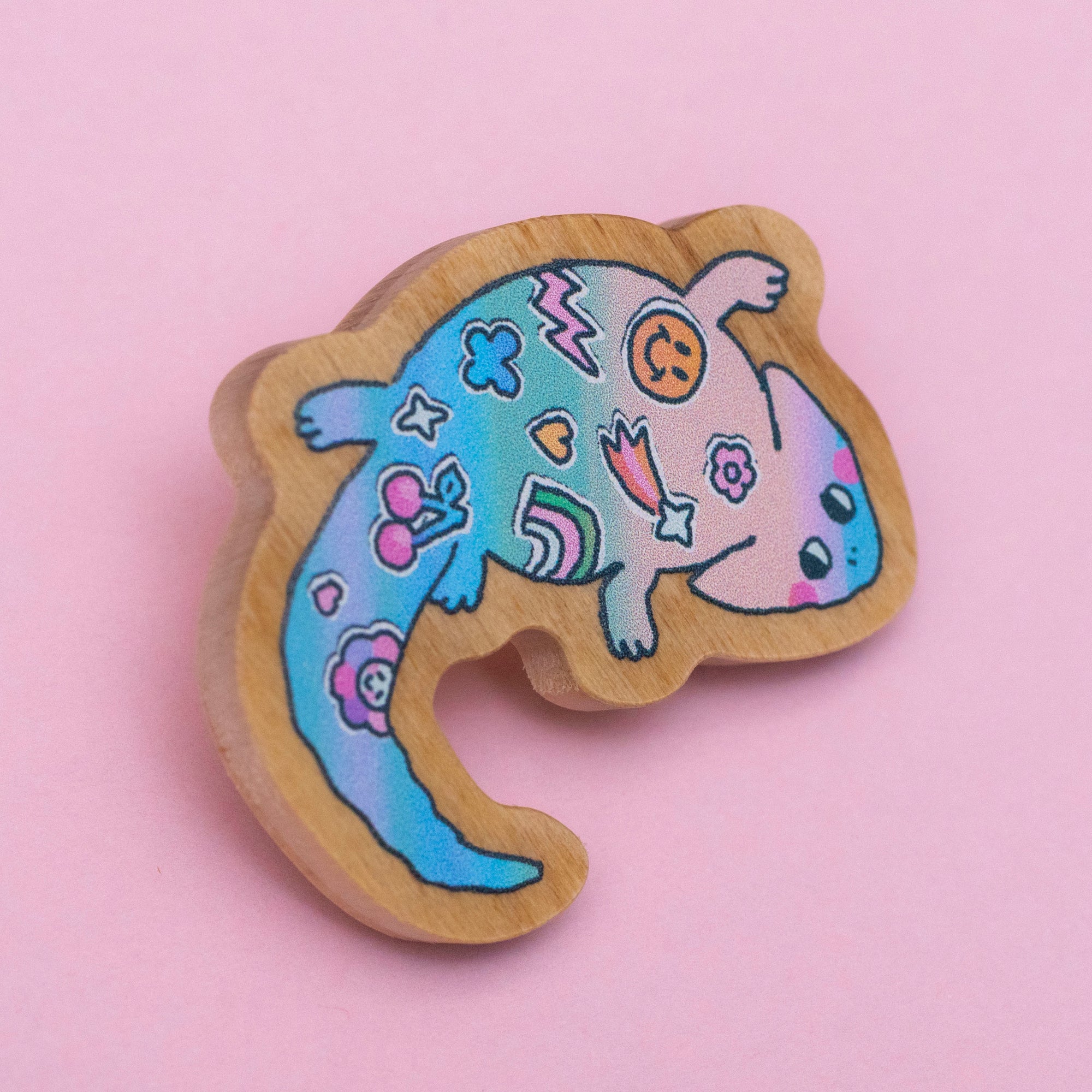 Diplocaulus was the largest of the now extinct lepospondyl amphibians. This particular wooden specimen is delightfully decorated in vibrant stickers. Quite the fashionable fellow!