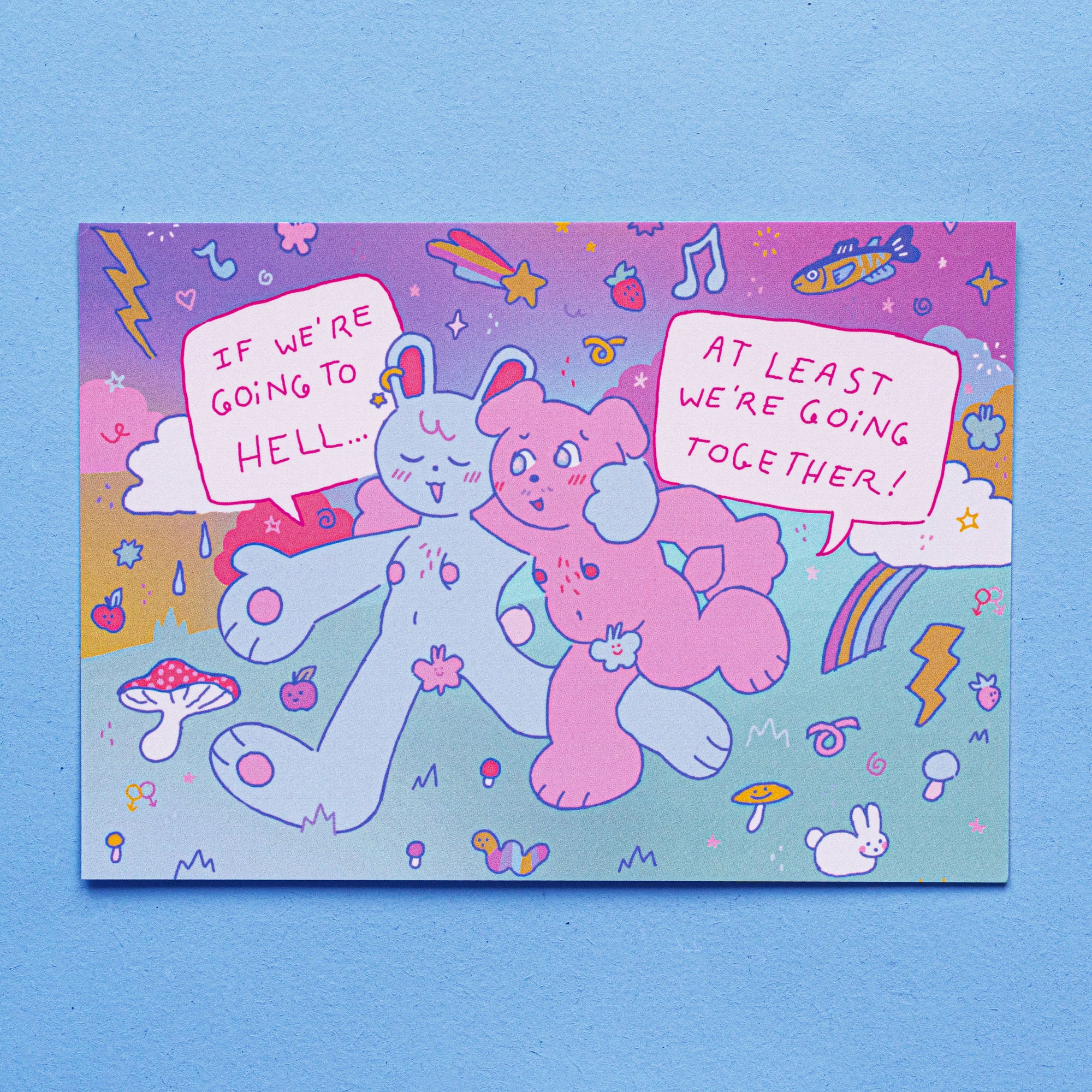 A high-quality postcard print by the wonderful Hehymn that celebrates queer connection and solidarity. Write a message and send to a loved one, or keep as a print and display in a sacred space.