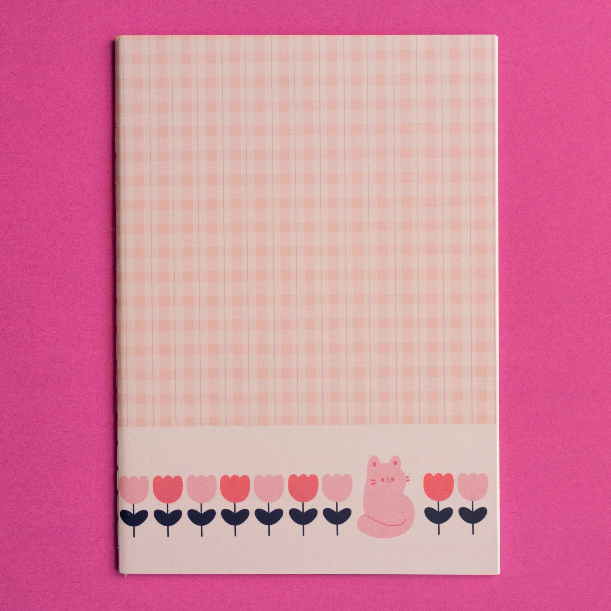 Ahhh, to be a cat lounging in the tulips. This little kitty has the right idea! With your choice of pink or lavender, these notebooks are sure to brighten your day when taking notes, writing list, doodling, sketching, etc. The possibilities are endless! Each notebook has a soft yet thick card-stock cover that is decorated on both the inside and out. There 24 sheets, (48 front and back), of line-less, cream A5 paper inside.