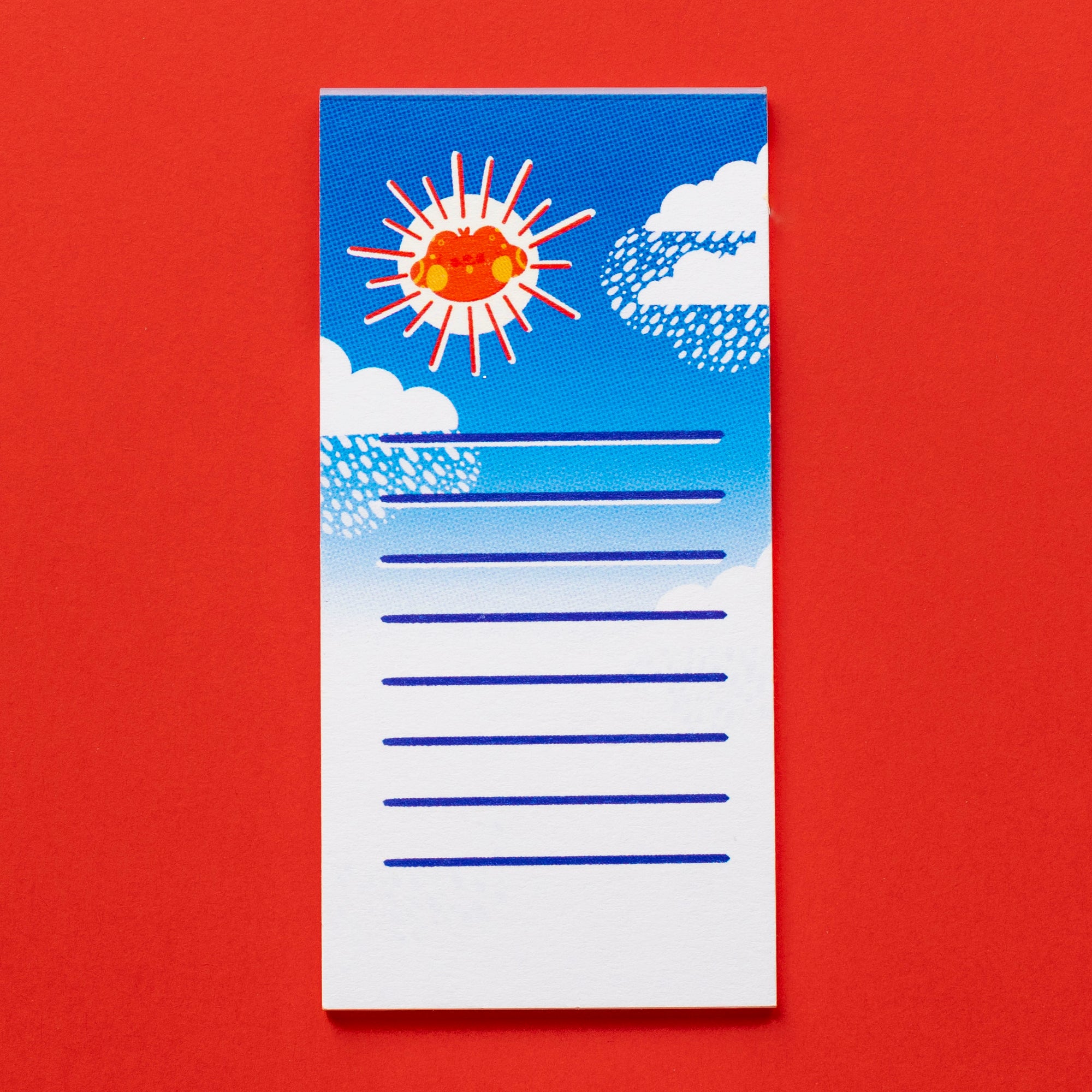 Woof woof! The puppydog sun is here to say hello! This adorable mini notepad is great for jotting down a quick note or a nice message to someone! The colors are super vibrant and contain a beautiful gradient. This mini notepad is printed on a glossy, yet writable paper stock! Each notepad contains approximately 25 sheets of the designed paper and comes securely glued together at the top with a firm cardboard backing.