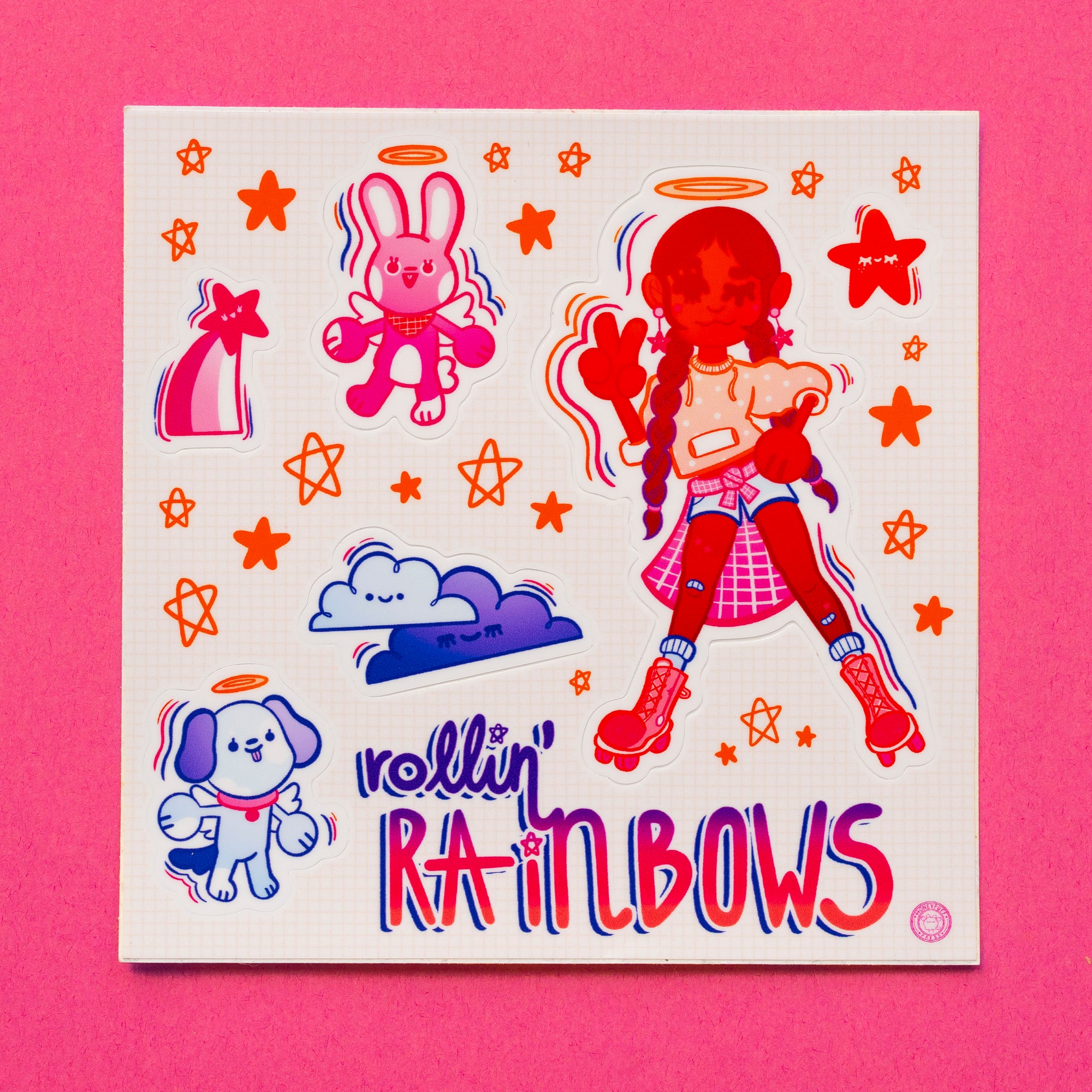 Rollin’ rainbows and skating stars! This magical sticker sheet is perfect for any skaters or skating fans! It comes with 6 vibrant and gloss-covered stickers, ranging anywhere between 25.4mm to 76.2mm in size! Each sticker comes cut-to-shape (die-cut) and coated in a glossy sheen, making their colors even more vibrant to the eye!