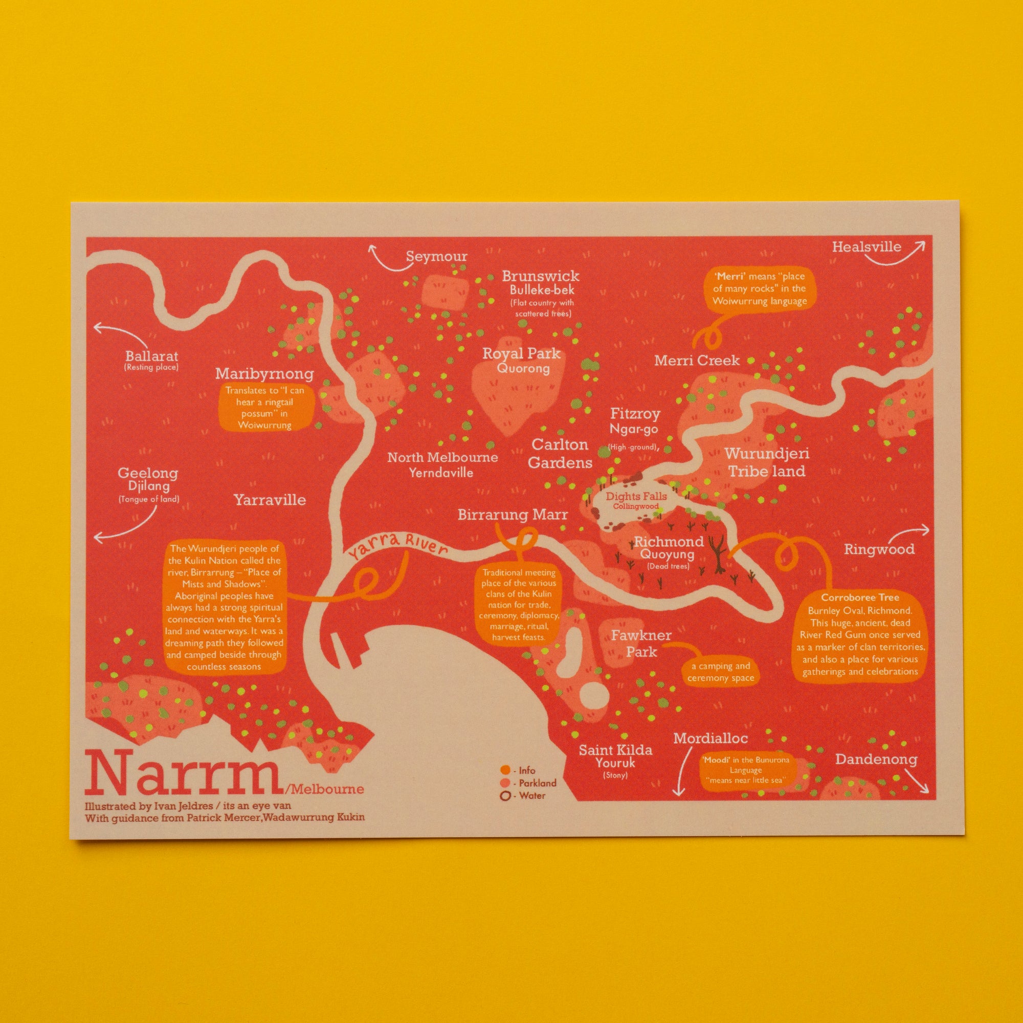 This map is full of information about Narrm and its indigenous history, allowing you to learn more about the history of where you live.Half of the proceeds made from the sale of each Maps will be donated to Pay the rent.*please note there is a small spelling mistake in regards to 'Kulin' where it was misspelt as 'Kukin'
