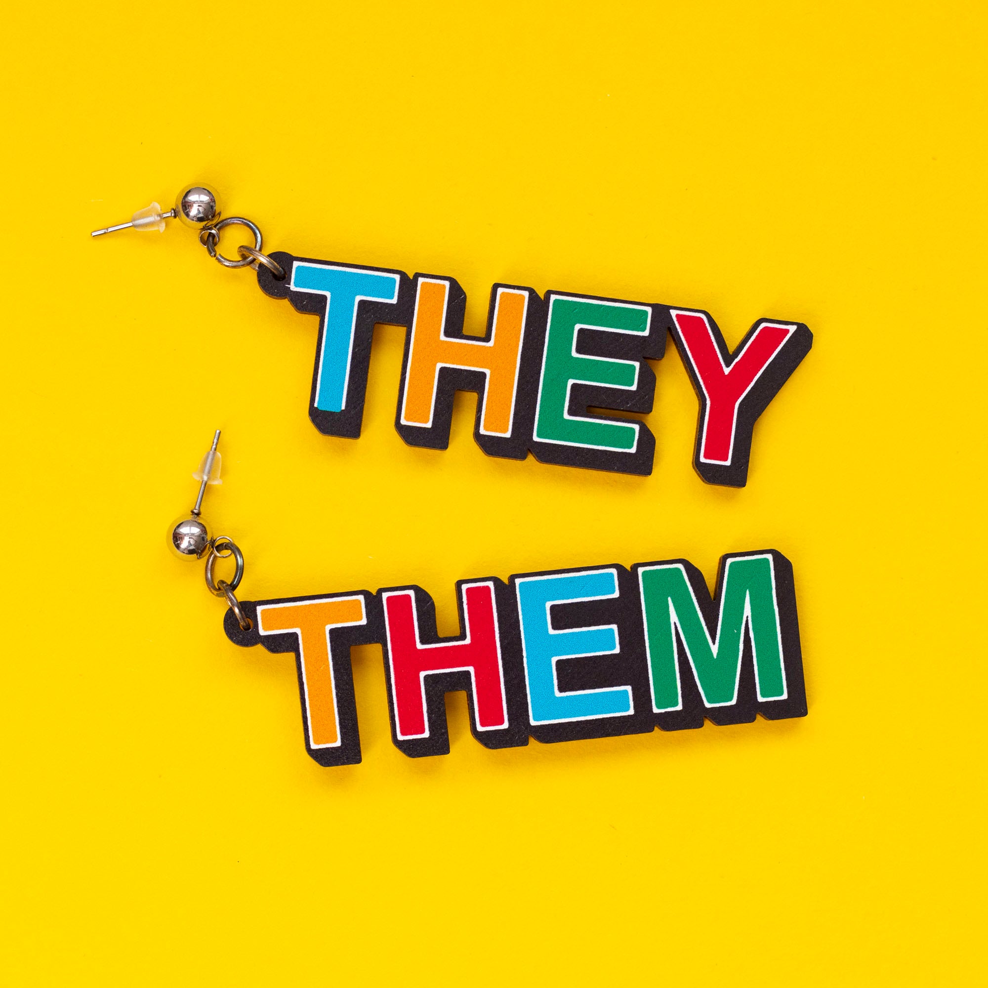 Be your authentic, colourful self with these They/Them pronoun earrings. The birch plywood makes these oversized earrings light and easy to wear throughout the day! ๐โ
