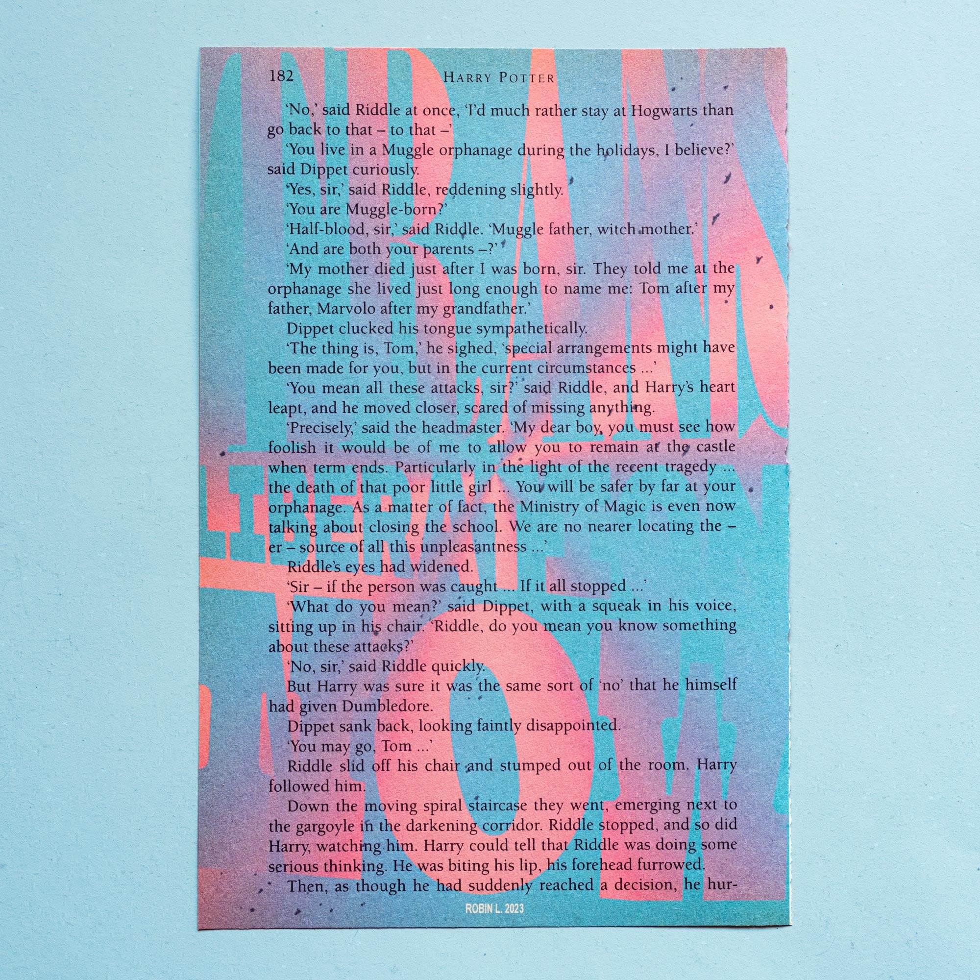 Printed on reclaimed pages of magical wizard parchment, this artwork transforms these pages into a celebration of the strength and story of trans people and communities on Trans Day of Visibility.