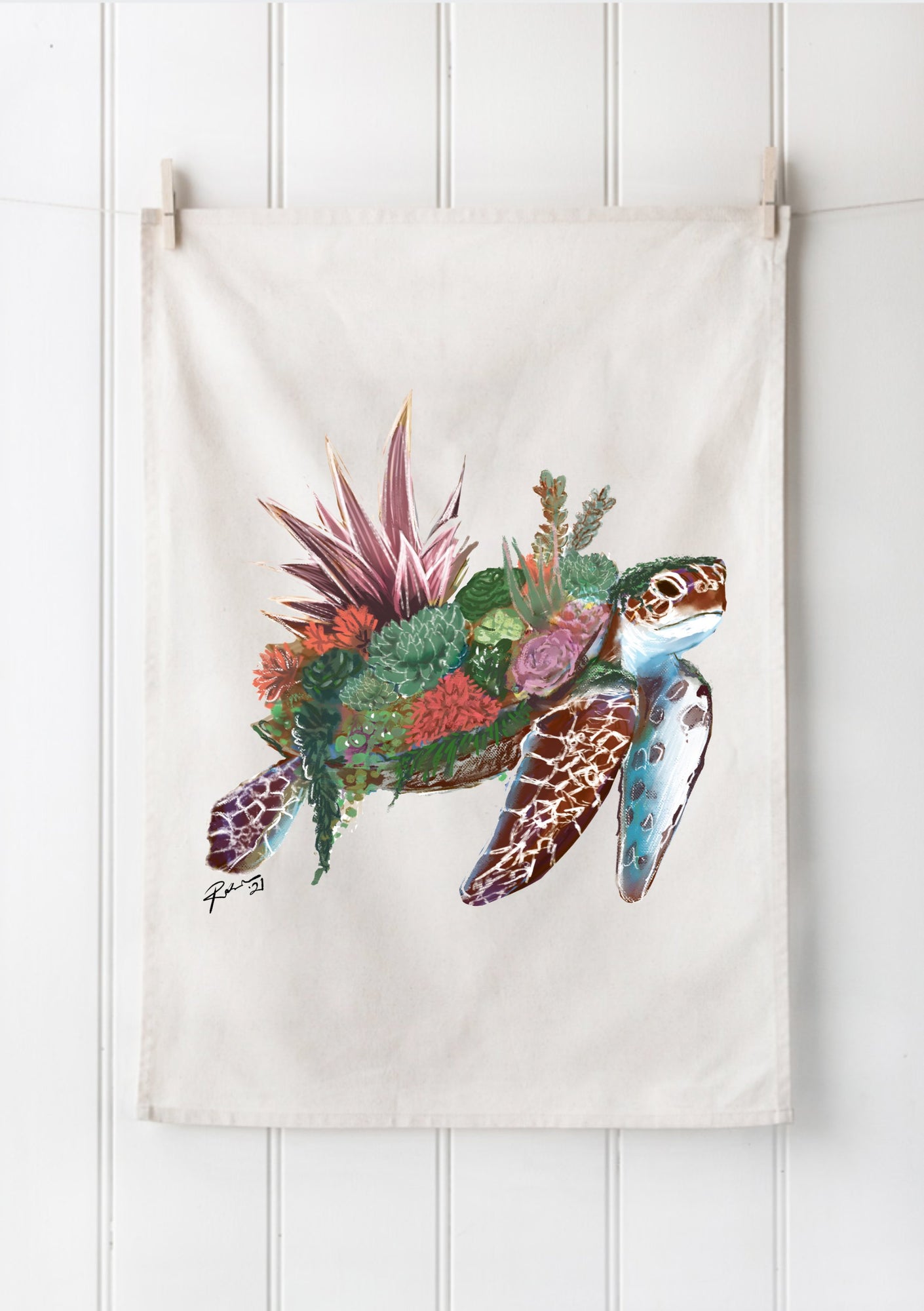 This Turtle-rrarium Tea Towel features a stylised turtle with a variety of succulents growing from its shell.