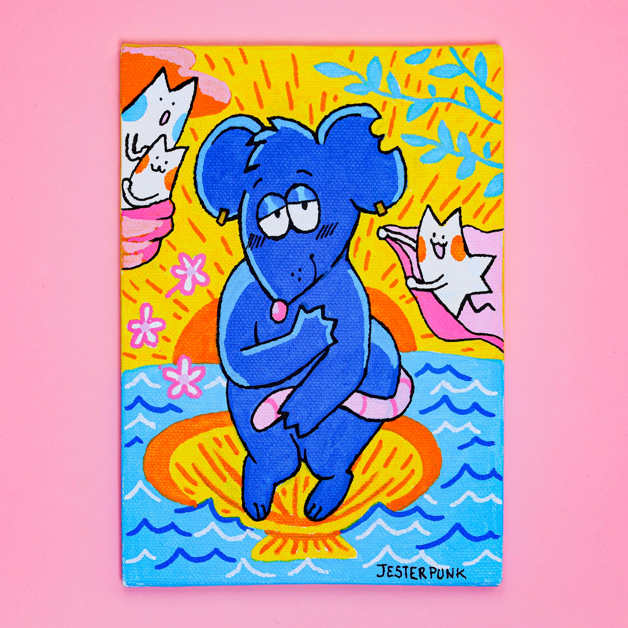 a recreation of a famous Botticelli piece, one of a kind original painting. depicts Lex emerging from a clam shell, fully formed, unbothered, hydrated, serving, etc