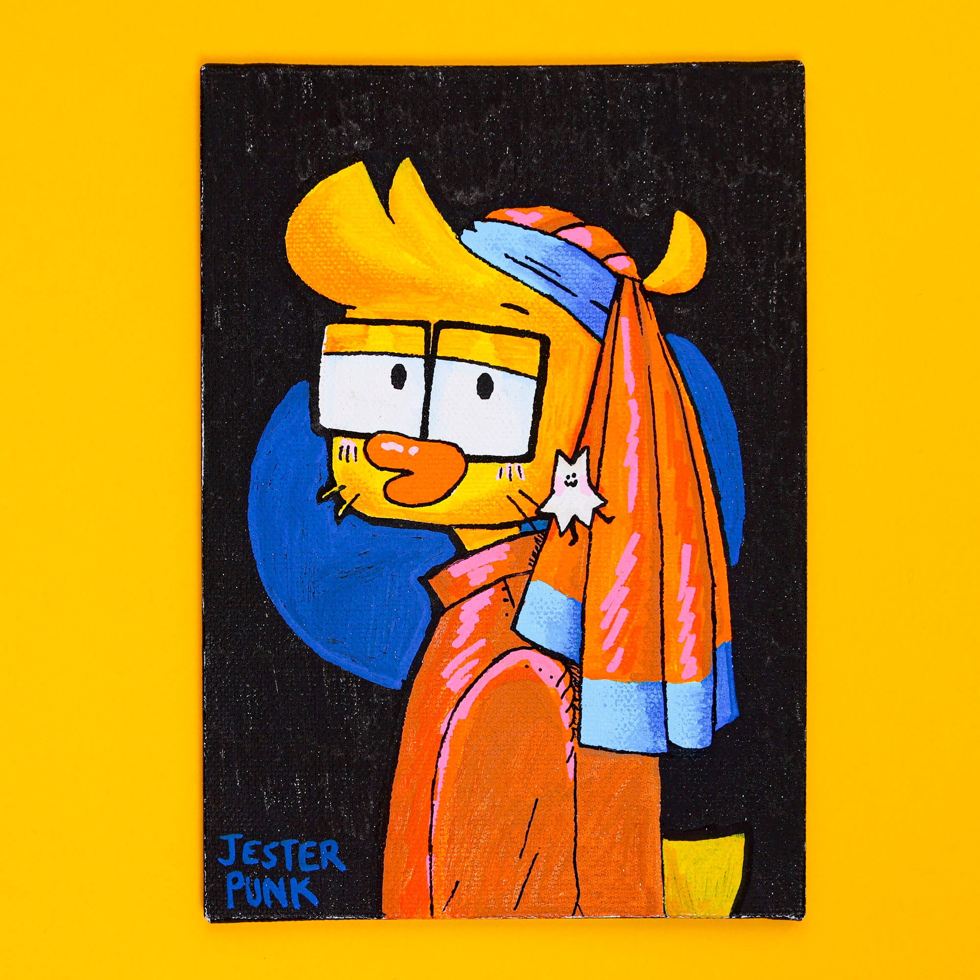 a recreation of a famous Vermeer piece, one of a kind original painting. depicts Skiff looking whistfully at the viewer, with a dash of intimacy. mawie is minding her own business while hanging off of Skiff's non-existant ear