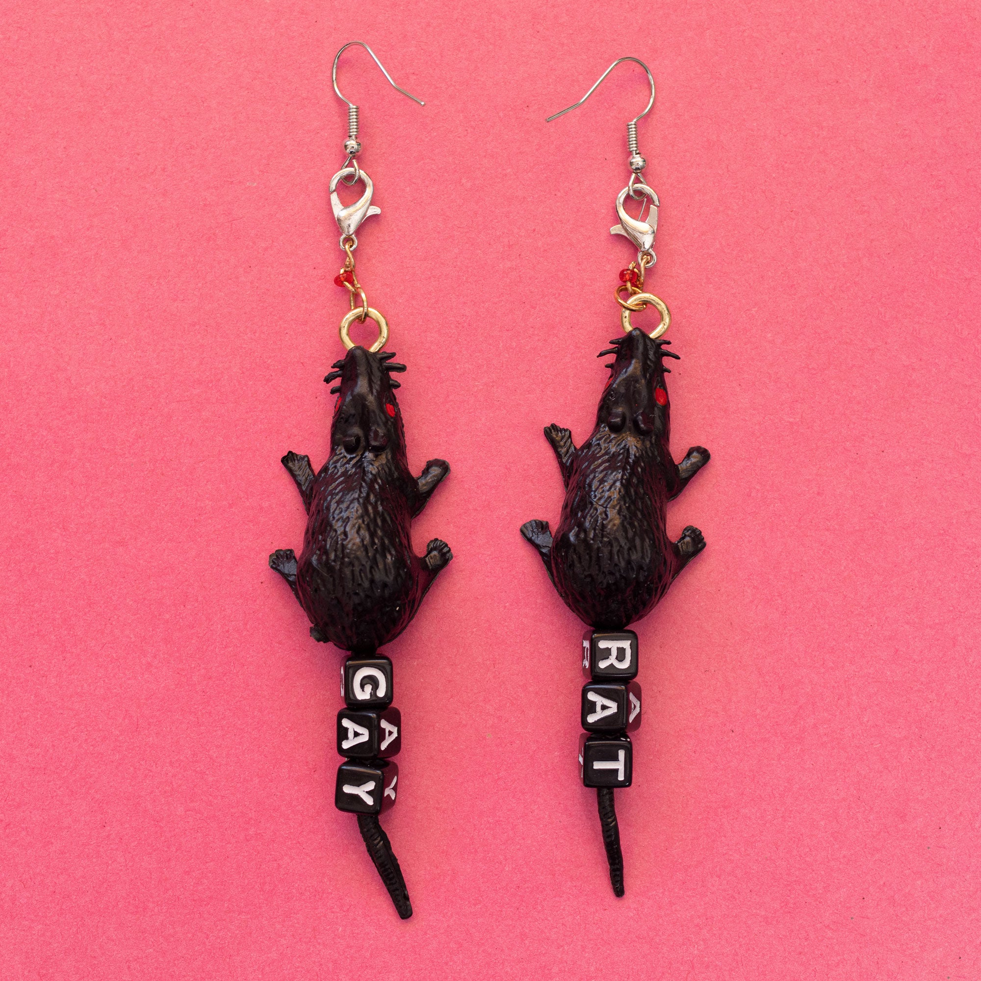 A delicate pair of gay rats, simple beading and gold metal chains. This pair is attached to lobster claw necklace clasps and so can be attached to anything the wearer desires.