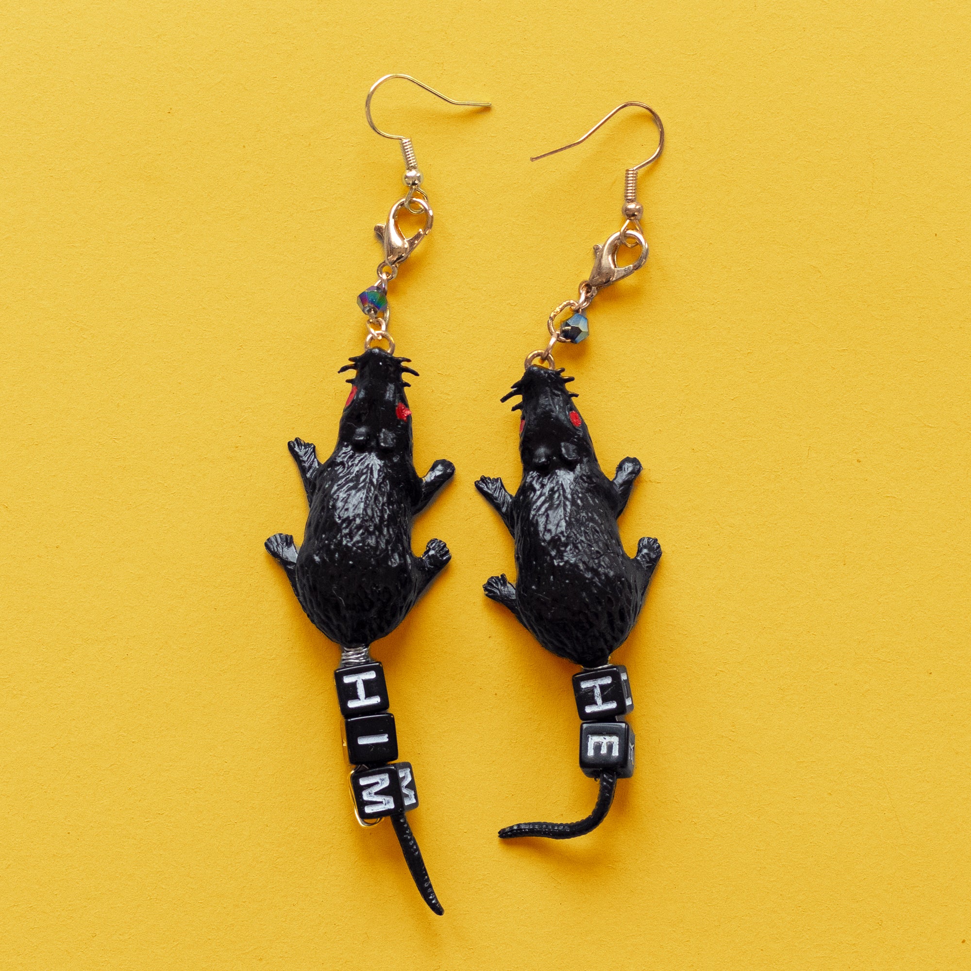 A delicate pair of rats showcasing he/him pronouns, simple beading and gold metal chains. This pair is attached to lobster claw necklace clasps and so can be attached to anything the wearer desires.