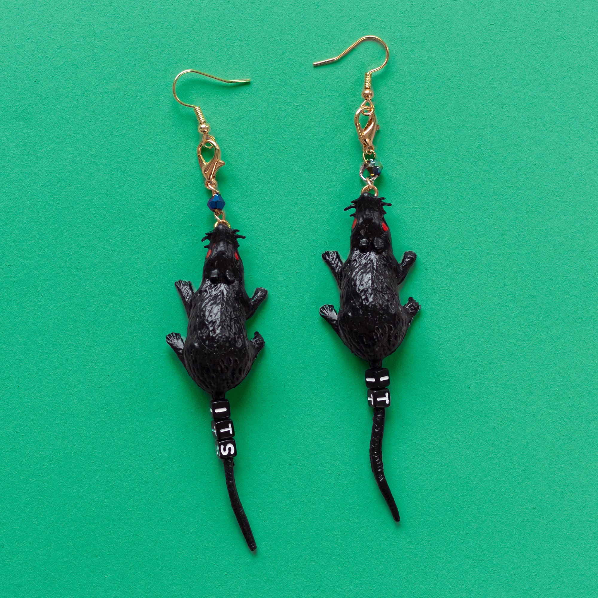 A delicate pair of rats showcasing it/its pronouns, simple beading and gold metal chains. This pair is attached to lobster claw necklace clasps and so can be attached to anything the wearer desires.
