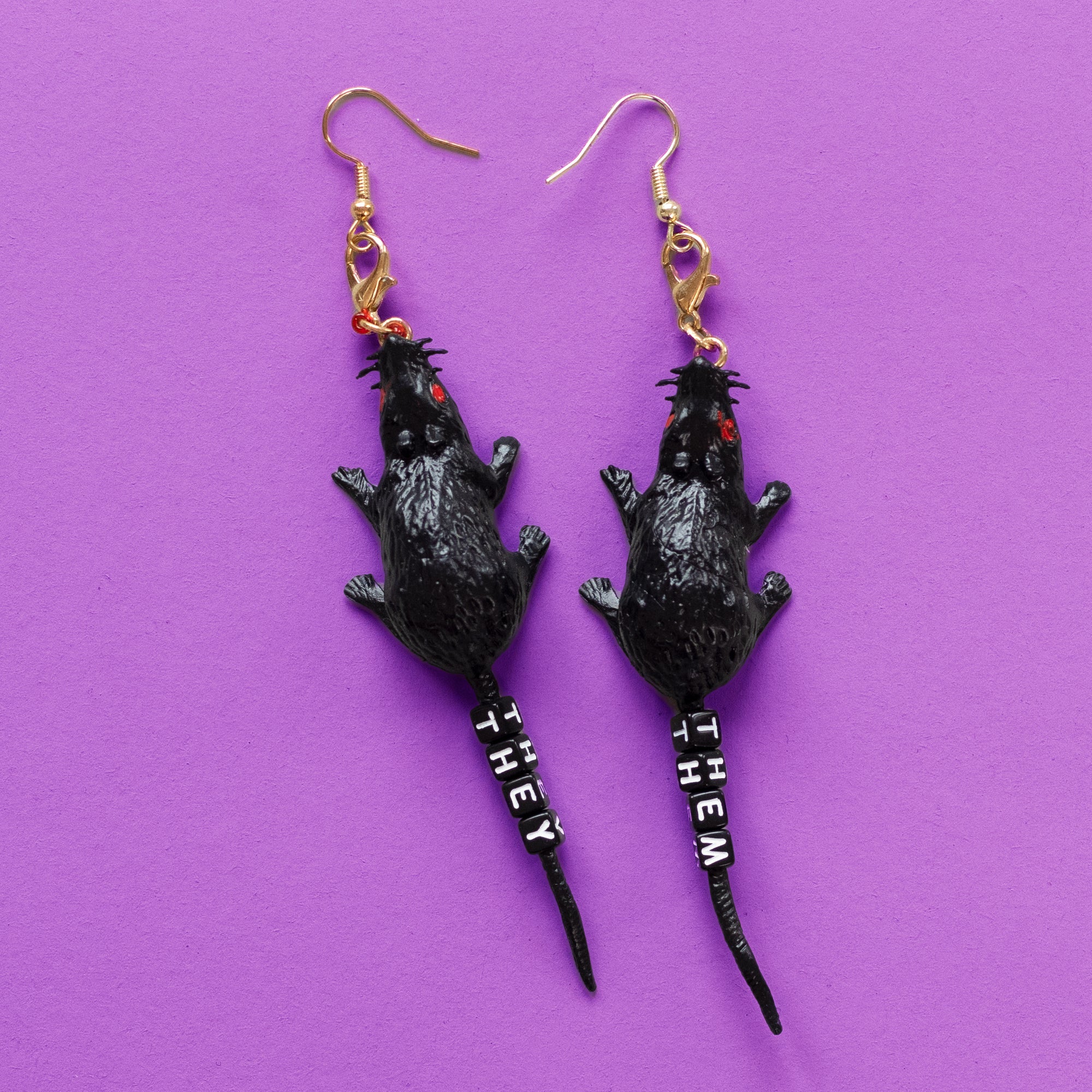 A delicate pair of rats showcasing they/thempronouns, simple beading and gold metal chains. This pair is attached to lobster claw necklace clasps and so can be attached to anything the wearer desires.