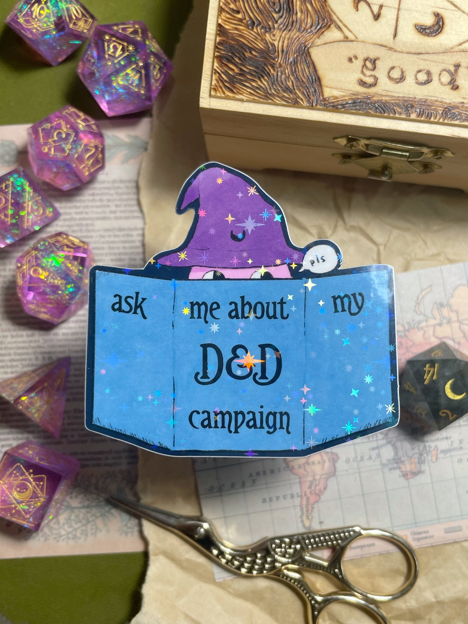 Dying to talk about your D&D campaign? Slap this sticker on everything in sight! Printed on high quality vinyl with a sparkly holographic stardust finish. Water proof, UV resistant and dishwasher safe!