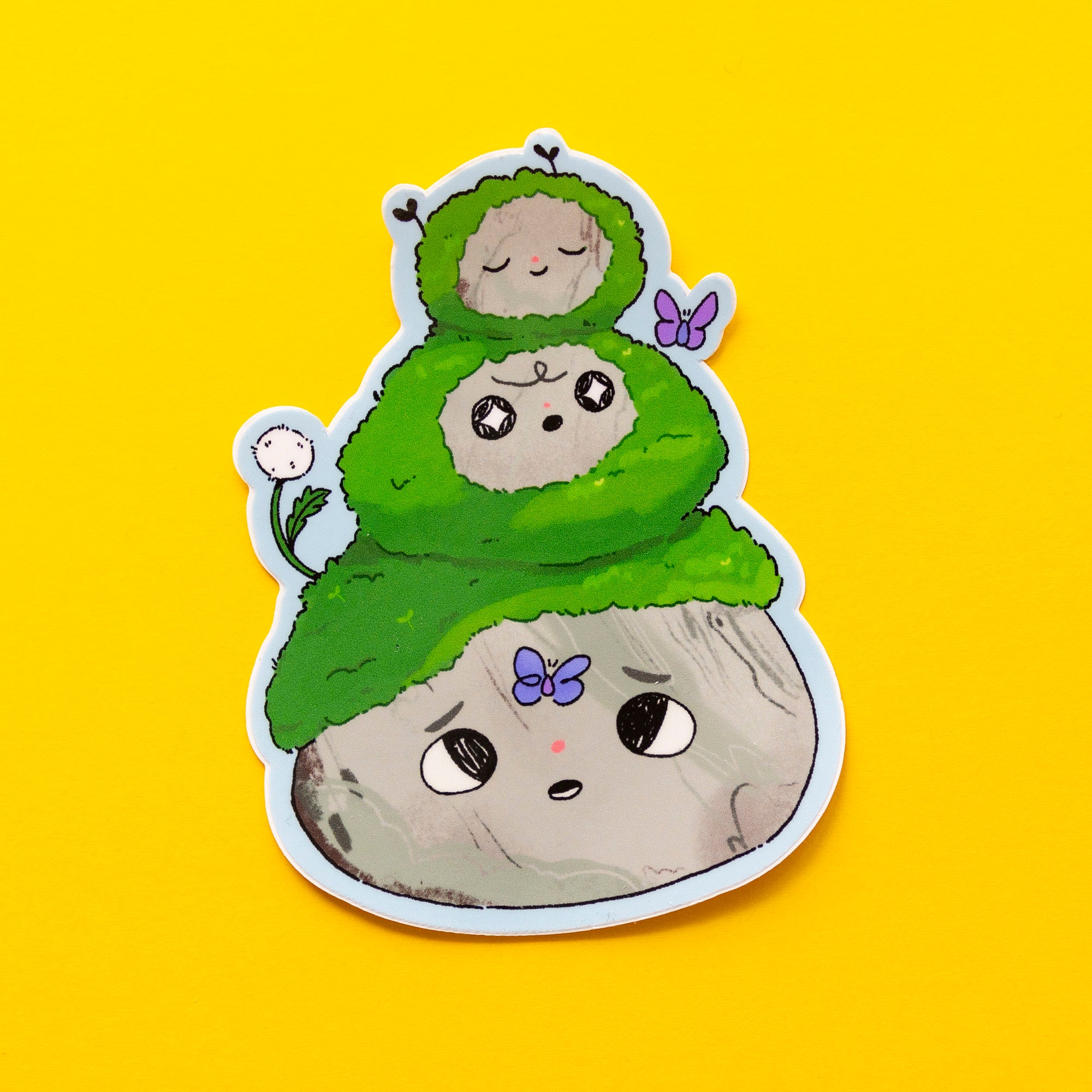 Tower of adorable, mossy-covered rocks! Printed on high quality glossy vinyl. Water proof, UV resistant and dishwasher safe!