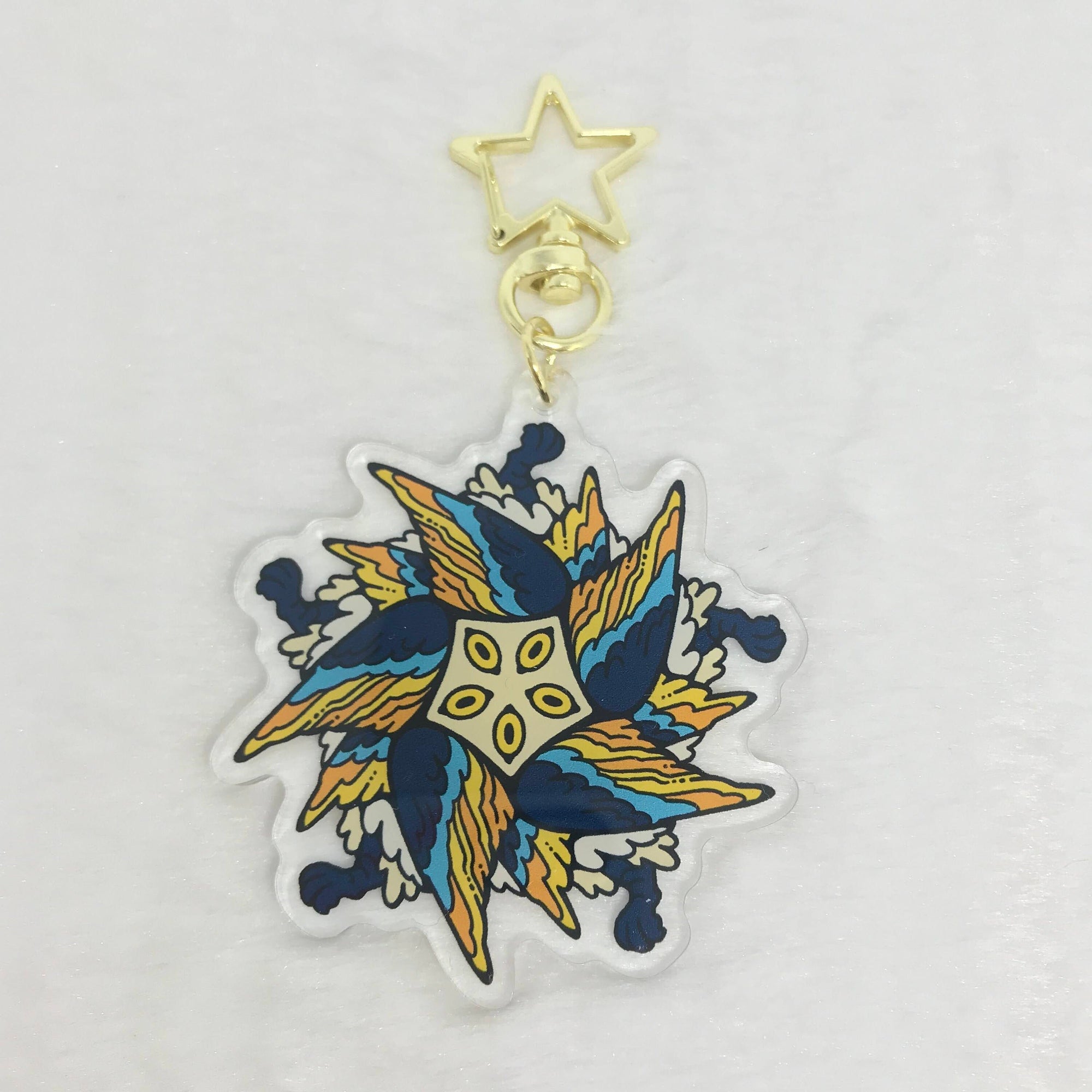 A many-legged, many-winged angel, for Aroace pride.This acrylic keychain is 2.5 inches (6.3 cm) long, double-sided with the same print on both sides. The keychain has a gold star-shaped clasp.Please note: the keychain comes with protective film that should be peeled off.