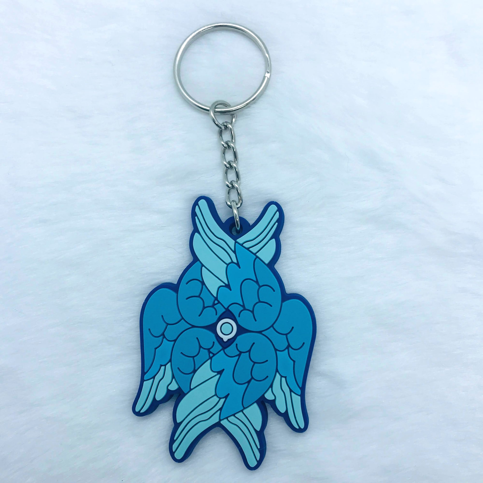 A weepy-eyed seraph with blue wings. The keychain is 2.5 inches (6.3 cm) long, made of PVC rubber. It features a design on one side. The keychain has a silver ring clasp.