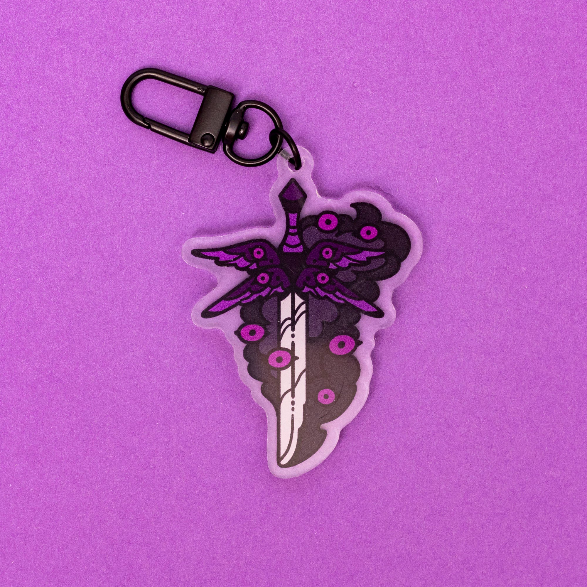 An eldritch angelic sword wreathed in smoke and eyes, for Demisexual pride. This acrylic keychain is 2.5 inches (6.3 cm) long, double-sided with the same print on both sides. The keychain has a black lobster clasp.Please note: the keychain comes with protective film that should be peeled off.