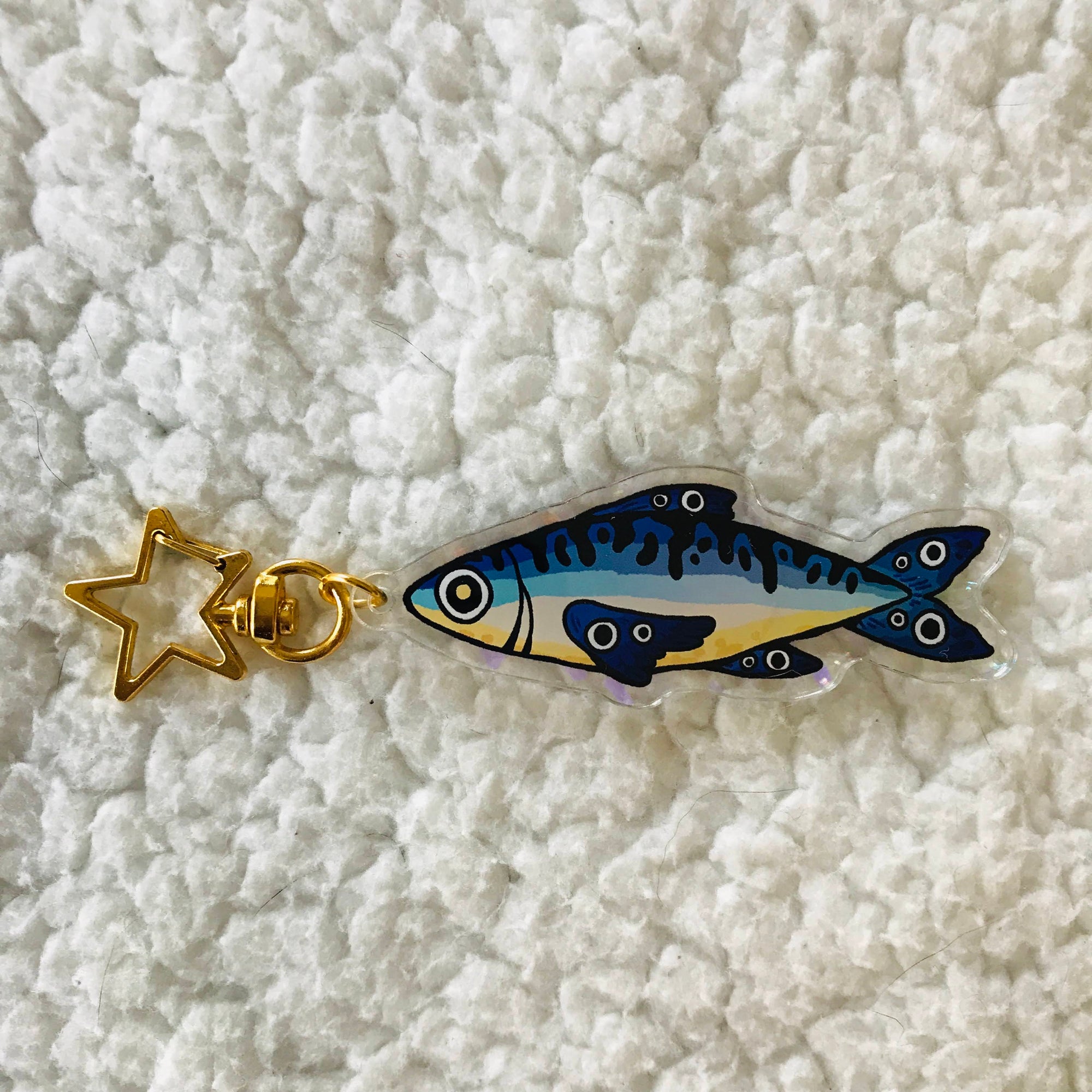 A completely normal mackerel! Well, maybe. The keychain is 3 inches (7.6 cm) long, made with holographic acrylic. It has the same print on both sides. The keychain has a gold star-shaped clasp.